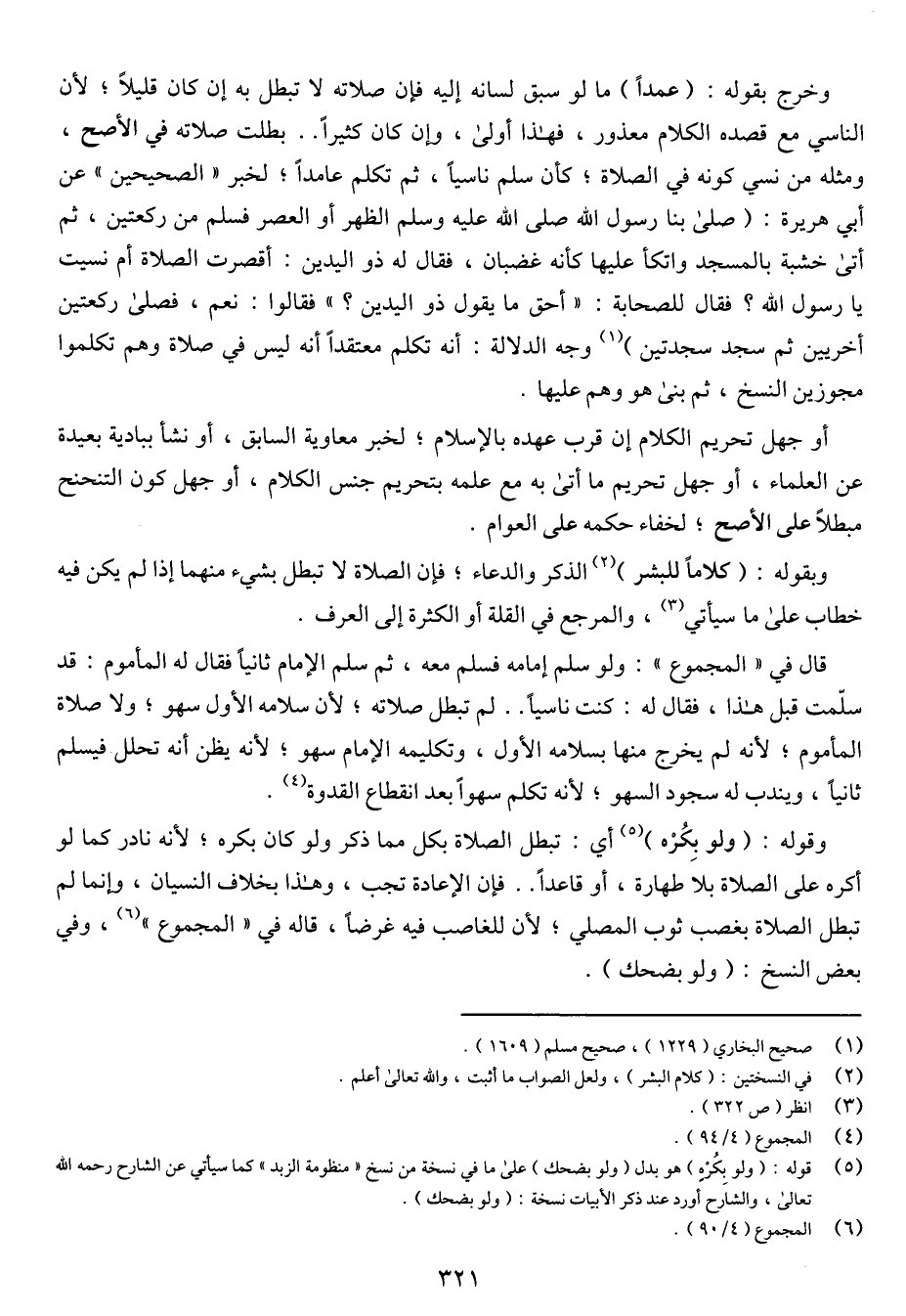 وخرج بقوله: (عمدا) ما لو سبق لسانه إليه فإن صلاته لا تبطل به إن كان قليلا، لأن الناسي مع قصده الكلام معذور، فهذا أولي، وإن كان كثيرا بطلت صلاته في الأصح، ومثله من نسي كونه في الصلاة، كأن سلم ناسيا، ثم تكلم عامدا، لخبر (الصحيحين) عن أبي هريرة: (صلى بنا رسول الله صلى الله عليه وسلم الظهر أو العصر فسلم من ركعتين، ثم أتي خشبة بالمسجد واتكأ عليها كأنه غضبان، فقال له ذو اليدين: أقصرت الصلاة أم نسيت يا رسول الله؟ فقال للصحابة: (أحق ما يقول ذو اليدين؟ ) فقالوا: نعم، فصلي ركعتين آخرين ثم سجد سجدتين) وجه الدلالة: أنه تكلم معتمدا أنه ليس في صلاة وهم تكلموا مجوزين النسخ، ثم بني هم وهو عليها.