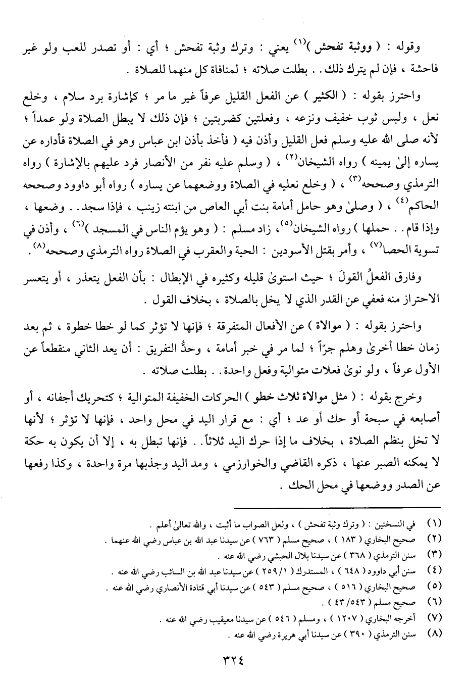 واحترز بقوله: (الكثير) عن الفعل القليل عرفا غير ما مر، كإشارة برد السلام، وخلع نعل، ولبس ثوب خفيف ونزعه، وفعلتين كضربتين، فإن ذلك لا يبطل الصلاة ولو عمدا، لأنه صلى الله عليه وسلم فعل القليل وأذن فيه (فأخذ بإذن ابن عباس وهو في الصلاة فأداره عن يساره إلى يمينه) رواه الشيخان، (وسلم عليه نفر من الأنصار فرد عليهم بالإشارة) رواه الترمذي وصححه، (وخلع نعليه في الصلاة ووضعهما عن يساره) رواه أبو داوود وصححه الحاكم، (وصلي وهو حامل أمامة بنت أبي العاص من ابنته زينب، فإذا سجد .. وضعها، وإذا قام .. حملها) رواه الشيخان، زاد مسلم: (وهو يؤم الناس في المسجد)، وأذن في تسوية الحصا، وأمر بقتل الأسودين: الحية والعقرب في الصلاة رواه الترمذي وصححه.