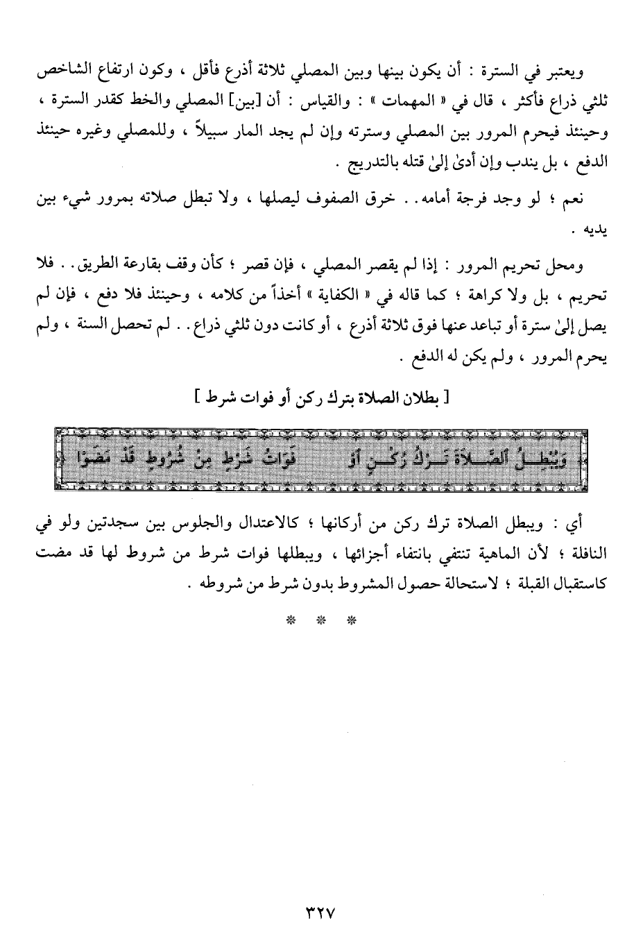 ويعتبر في السترة: أن يكون بينها وبين المصلي ثلاثة أذرع فأقل، وكون ارتفاع الشاخص ثلثي ذراع فأكثر، قال في (المهمات): والقياس: أن [بين] المصلي والخط كقدر السترة، وحينئذ فيحرم المرور بين المصلي وسترته وإن لم يجد المار سبيلا، وللمصلي وغيره حينئذ الدفع، بل يندب وإن أدي إلى قتله بالتدريج.