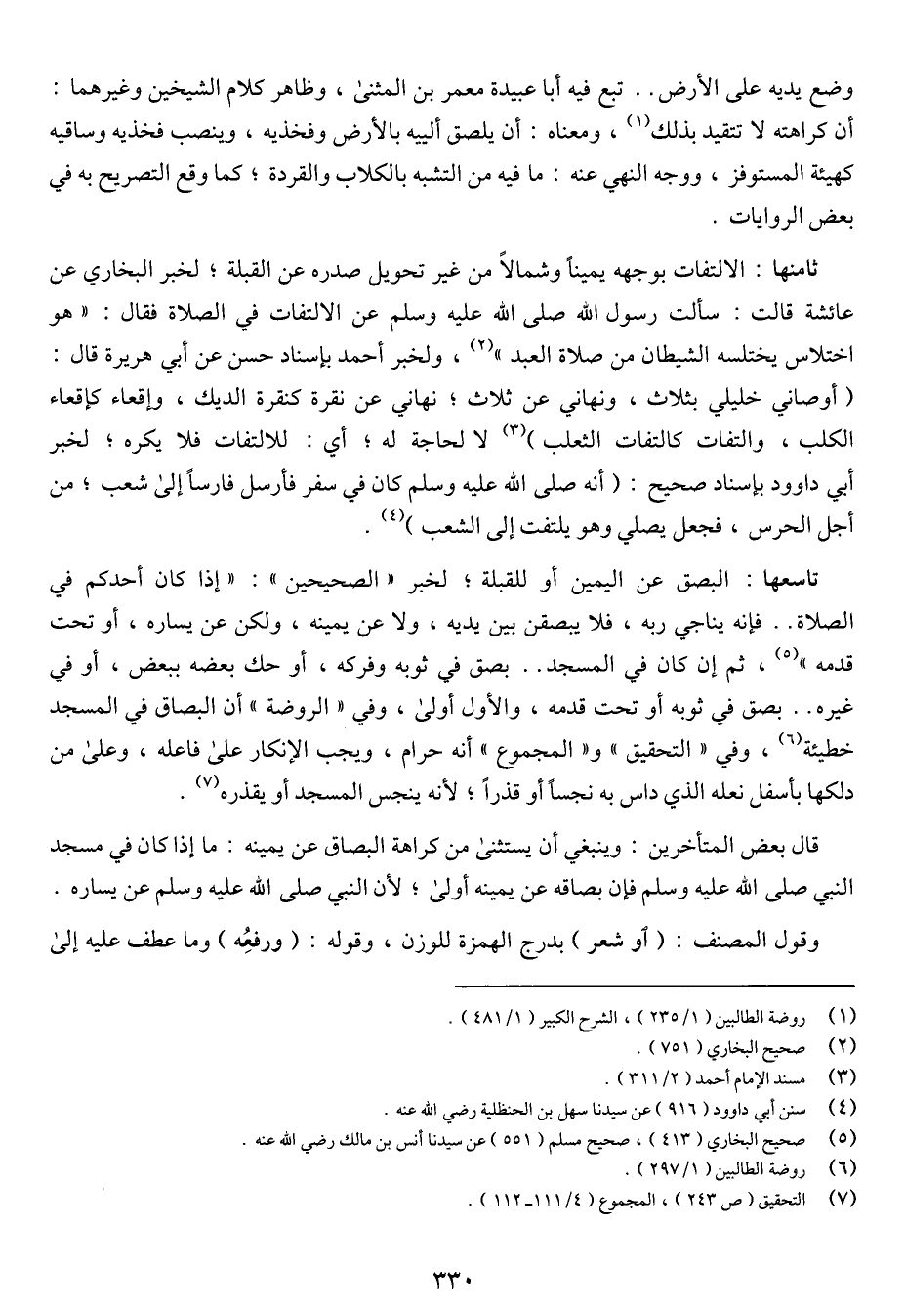 وضع يديه على الأرض .. تبع فيه أبا عبيدة معمر بن المثني، وظاهر كلام الشيخين وغيرهما: أن كراهته لا تتقيد بذلك، ومعناه: أن يلصق ألييه بالأرض وفخذيه، وينصب فخذيه وساقيه كهيئة المستوفز، ووجه النهي عنه: ما فيه التشبه بالكلاب والقردة، كما وقع التصريح به في بعض الروايات.