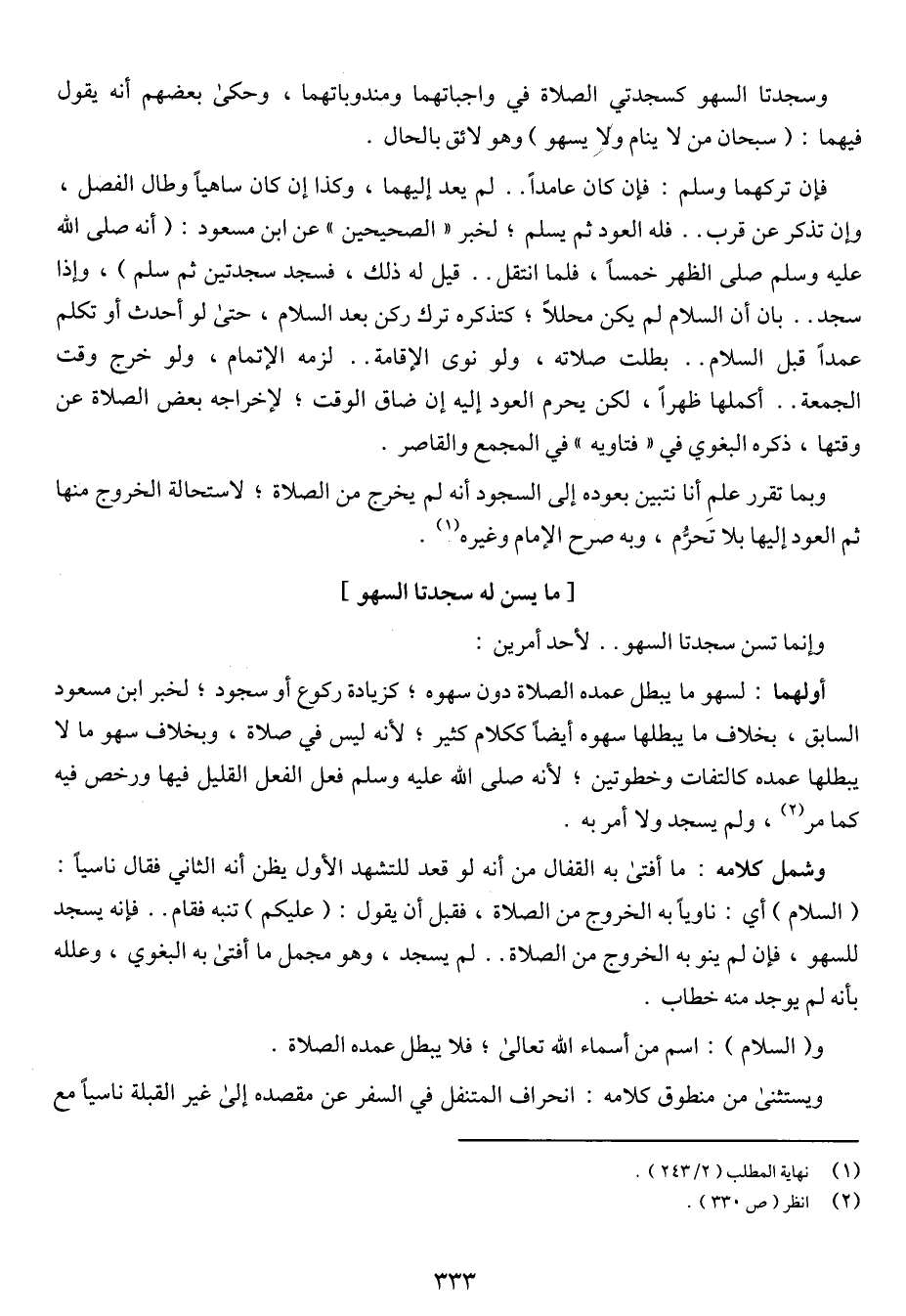 أولهما: لسهو ما يبطل عمده الصلاة دون سهوه، كزيادة ركوع أو سجود، لخبر ابن مسعود السابق، بخلاف ما يبطلها سهوه أيضا ككلام كثير، لأنه ليس في صلاة، وبخلاف سهو ما لا يبطلها عمده كالتفات وخطوتين، لأنه صلى الله عليه وسلم فعل الفعل القليل فيها ورخص فيه كما مر، ولم يسجد ولا أمر به.