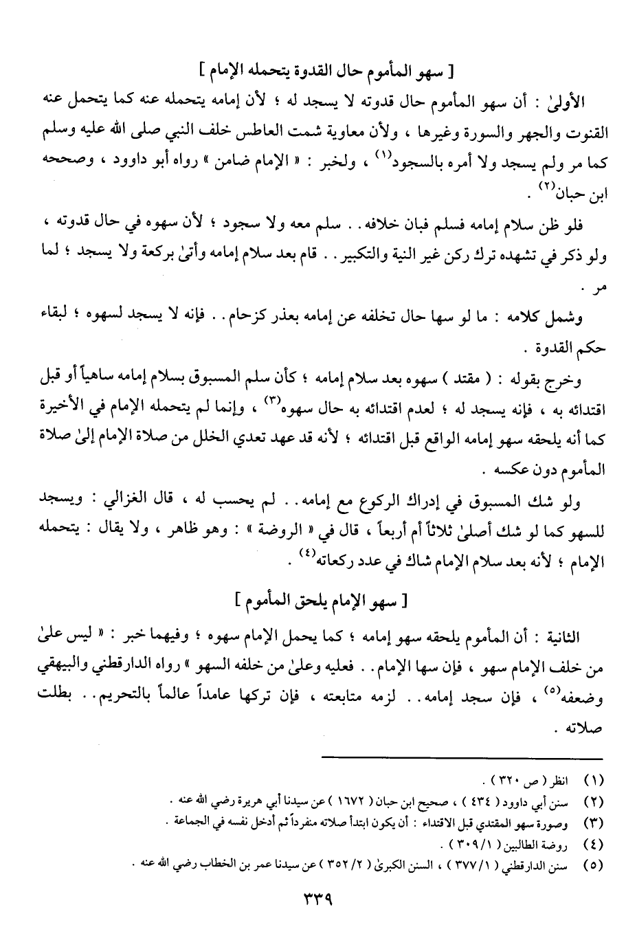 الأولي: أن سهو المأموم حال قدوته لا يسجد له، لأن غمامه يتحمله عنه كما يتحمل عنه القنوت والجهر والسورة وغيرها، ولأن معاوية شمت العاطس خلف النبي صلى الله عليه وسلم كما مر ولم يسجد ولا أمر بالسجود، ولخبر: (الإمام ضمن) رواه أبو داوود، وصححه ابن حبان.