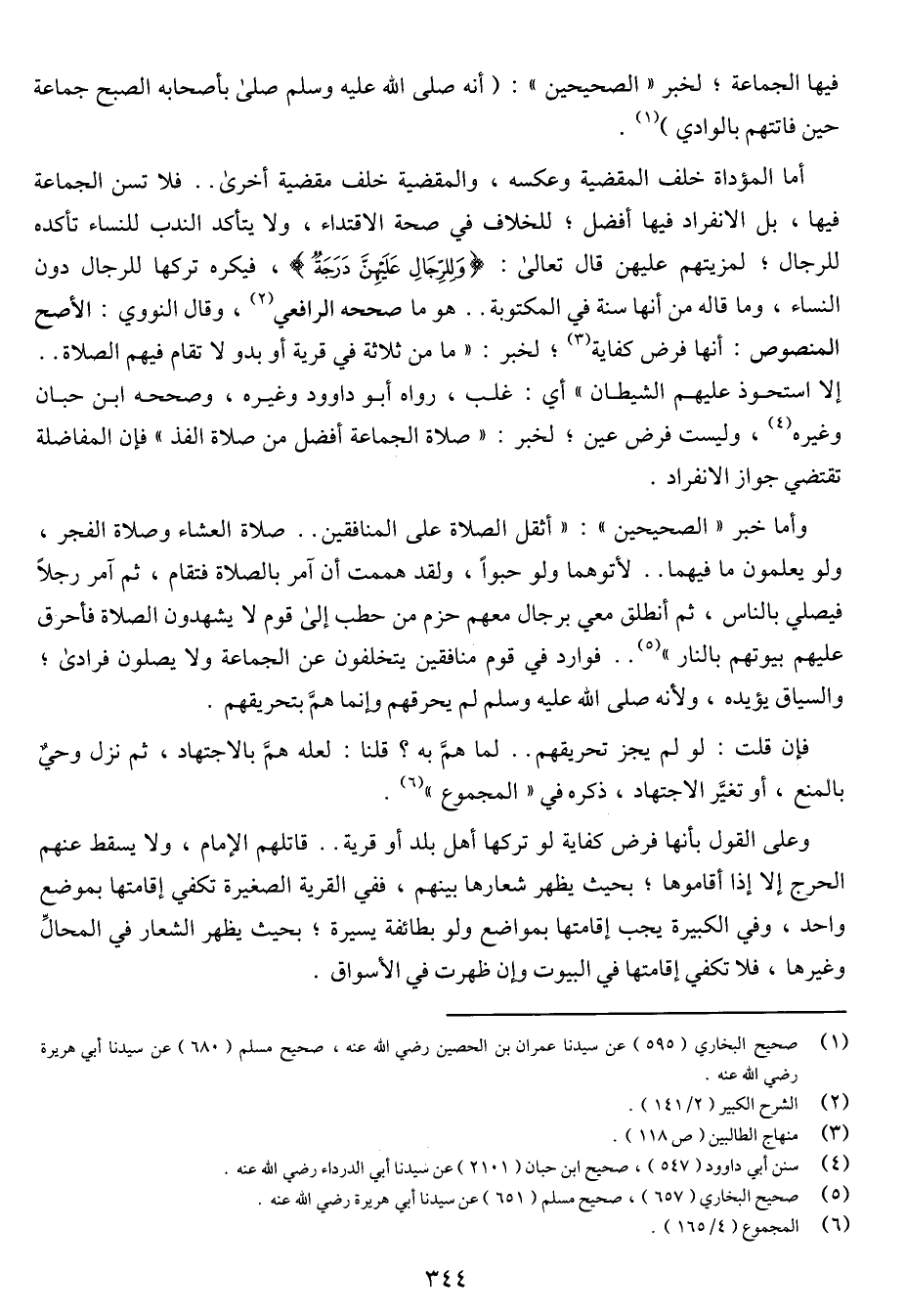 أما المؤداة خلف المقضية وعكسه، والمقضية خلف مقضيه أخري .. فلا تسن الجماعة فيها، بل الانفراد فيها أفضل، للخلاف في صحة الاقتداء، ولا يتأكد الندب للنساء تأكده للرجال، لمزيتهم عليهن قال تعالى: {وللرجال عليهن درجة} [سورة البقر: 228]، فيكره تركها للرجال دون النساء، وما قاله أنه سنة في المكتوبة .. هو ما صححه الرافعي، وقال النووي: الأصح المنصوص: أنها فرض كفاية، لخبر: (ما من ثلاثة في قرية أو بدو لا تقام فيهم الصلاة .. إلا استحوذ عليهم الشيطان) أي: غلب، رواه أبو داوود وغيره، وصححه ابن حبان وغيره، وليست فرض عين، لخبر: (صلاة الجماعة أفضل من صلاة الفذ) فإن المفاضلة تقتضي جواز الانفراد.