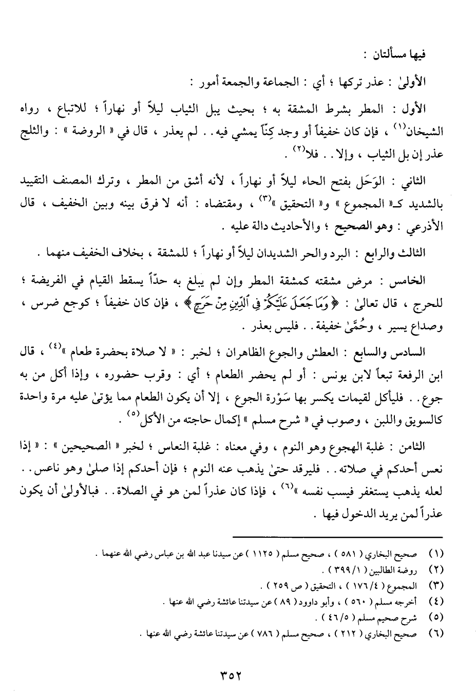 الأولى: عذر تركها؛ أي: الجماعة والجمعة أمور: