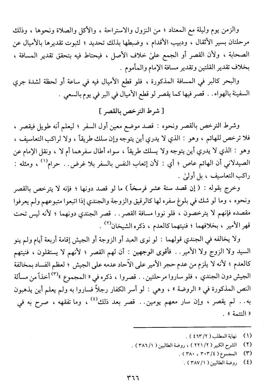 والزمن يوم وليلة مع المعتاد؛ من النزول والاستراحة، والأكل والصلاة ونحوها، وذلك مرحلتان بسير الأثقال، ودبيب الأقدام، وضبطها بذلك تحديد؛ لثبوت تقديرها بالأميال عن الصحابة، ولأن القصر أو الجمع على خلاف الأصل، فيحتاط فيه بتحقق تقدير المسافة، بخلاف تقدير القلتين وتقدير مسافة الإمام والمأموم.