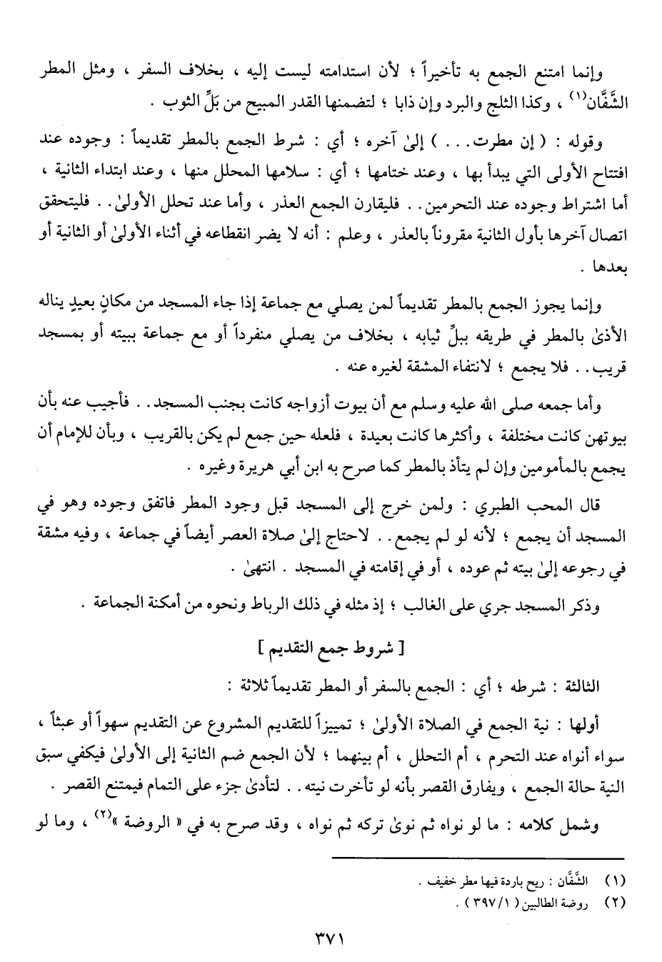 وإنما امتنع الجمع به تأخيراً؛ لأن استدامته ليست إليه، بخلاف السفر، ومثل المطر الشفان، وكذا الثلج والبرد وإن ذابا؛ لتضمنها القدر المبيح من بل الثوب.