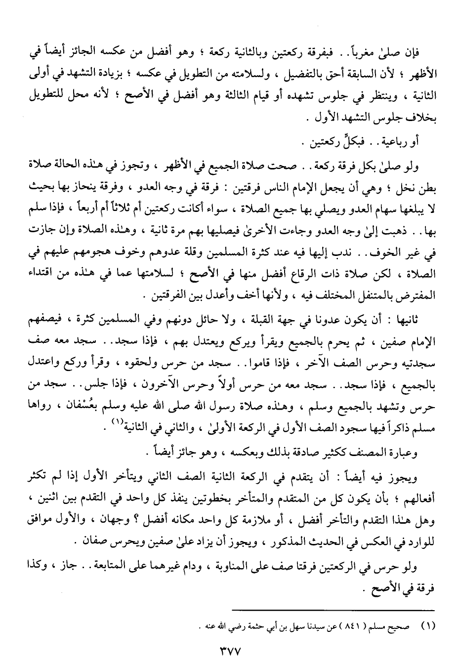 ولو صلى بكل فرقة ركعة .. صحت صلاة الجميع في الأظهر، وتجوز في هذه الحالة صلاة بطن نخل؛ وهي أن يجعل الإمام الناس فرقتين: فرقة في وجه العدو، وفرقة ينحاز بها بحيث لا يبلغها سهام العدو ويصلي بها جميع الصلاة، سواء أكانت ركعتين أم ثلاثاً أم ثلاثاً أو أربعاً، فإذا سلم بها .. ذهبت إلى وجه العدو وجاءت الأخرى فيصليها بهم مرة ثانية، وهذه الصلاة وإن جازت في غير الخوف .. ندب إليها فيه عند كثرة المسلمين وقلة عدوهم وخوف هجومهم عليهم في الصلاة، لكن صلاة ذات الرقاع أفضل منها في الأصح؛ لسلامتها عما في هذه من اقتداء المفترض بالمتنفل المختلف فيه، ولأنها أخف وأعدل بين الفرقتين.