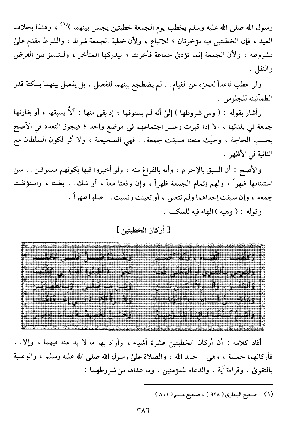 أفاد كلامه: أن أركان الخطبتين عشرة أشياء، وأراد بها ما لا بد منه فيهما، وإلا فأركانهما خمسة، وهي: حمد الله، والصلاة على رسول الله صلى الله عليه وسلم، والوصية بالتقوى، وقراءة آية، والدعاء للمؤمنين، وما عداها من شروطهما: