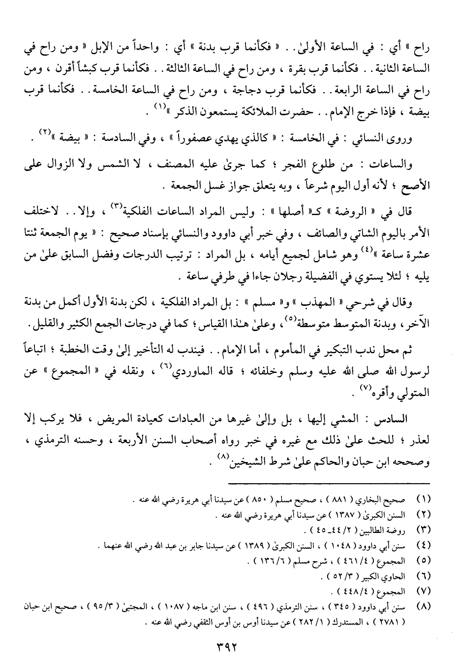 قال في "الروضة" كـ"أصلها": وليس المراد الساعات الفلكية، وإلا .. لاختلف الأمر باليوم الشاتي والصائف، وفي خبر أبي داوود والنسائي بإسناد صحيح: "يوم الجمعة ثنتا عشرة ساعة" وهو شامل لجميع أيامه، بل المراد: ترتيب الدرجات وفضل السابق على من يليه؛ لئلا يستوي في الفضيلة رجلان جاءا في طرفي ساعة.