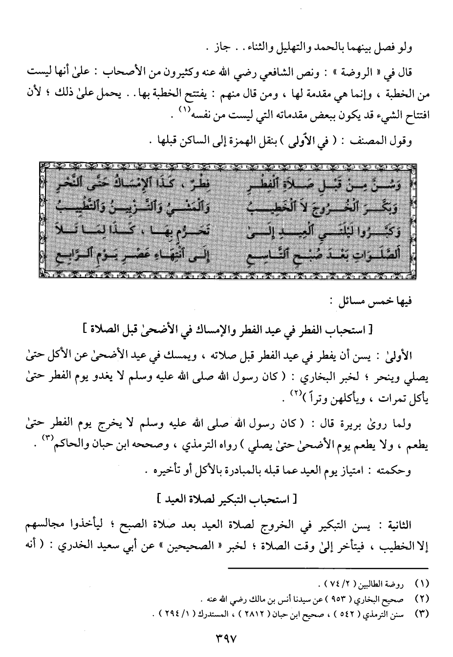 الأولى: يسن أن يفطر في عيد الفطر قبل صلاته، ويمسك في عيد الأضحى عن الأكل حتى يصلي وينحر؛ لخبر البخاري: (كان رسول الله صلى الله عليه وسلم لا يغدو يوم الفطر حتى يأكل تمرات، ويأكلهن وتراً).
