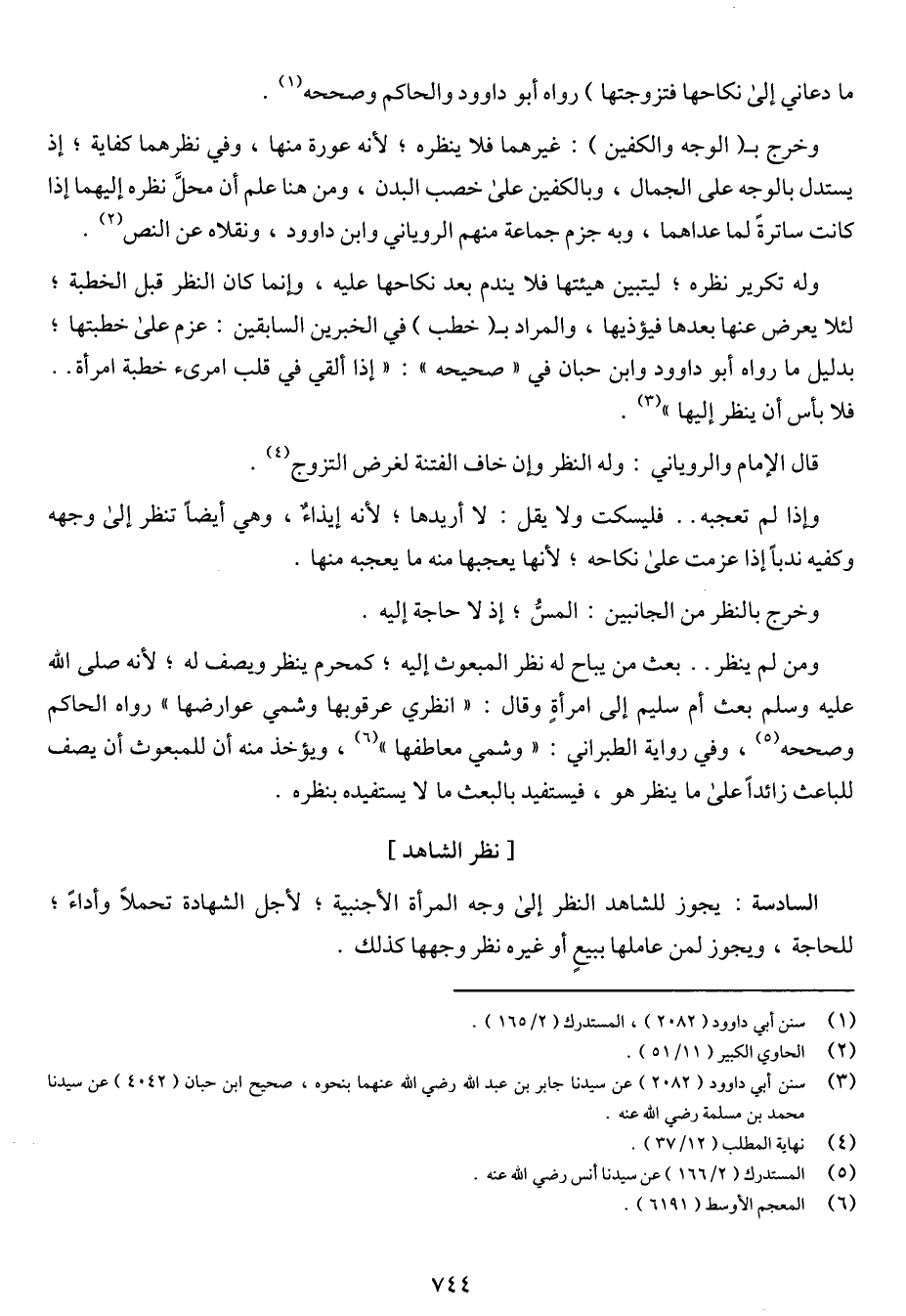 السادسة: يجوز للشاهد النظر إلى وجه المرأة الأجنبية؛ لأجل الشهادة تحملاً وأداء؛ للحاجة، ويجوز لمن عاملها ببيع أو غيره نظر وجهها كذلك.