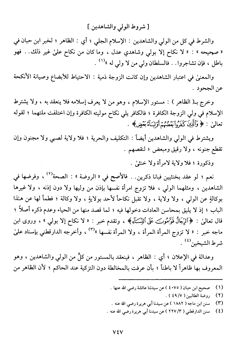 والشرط في كل من الولي والشاهدين: الإسلام الجلي؛ أي: الظاهر؛ لخبر ابن حبان في "صحيحه": "لا نكاح إلا بولي وشاهدي عدل، وما كان من نكاح على غير ذلك .. فهو باطل، فإن تشاجروا .. فالسلطان ولي من لا ولي له".