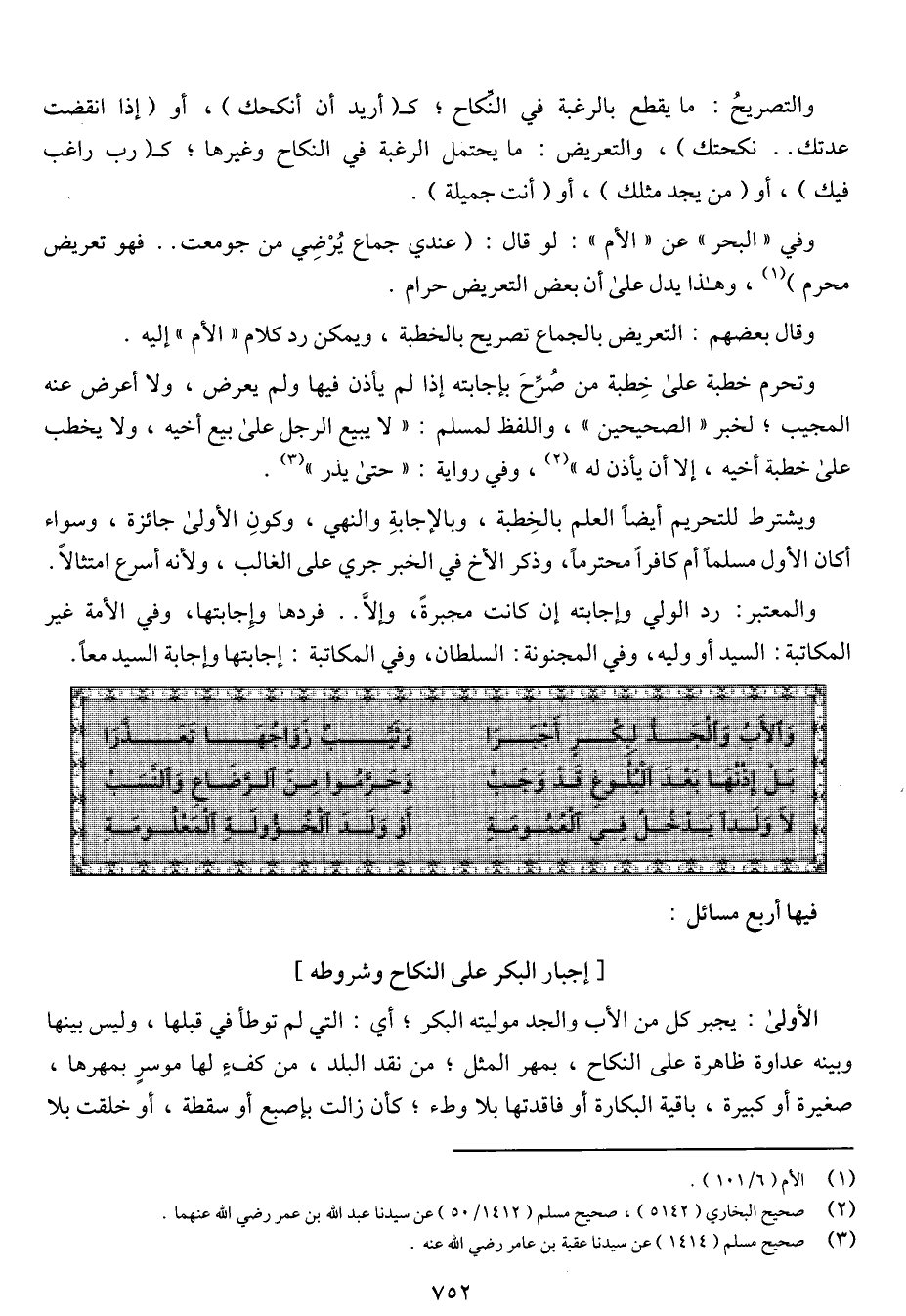 الأولى: يجبر كل من الأب والجد موليته البكر؛ أي: التي لم توطأ في قبلها، وليس بينها وبينه عداوة ظاهرة على النكاح، بمهر المثل؛ من نقد البلد، من كفء لها موسر بمهرها، صغيرة أو كبيرة، باقية البكارة أو فاقدتها بلا وطء؛ كأن زالت بإصبع أو سقطة، أو خلقت بلا