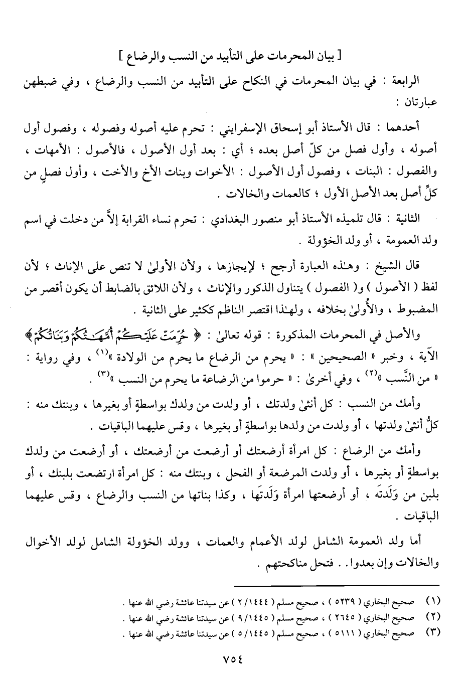الرابعة: في بيان المحرمات في النكاح على التأبيد من النسب والرضاع، وفي ضبطهن عبارتان: