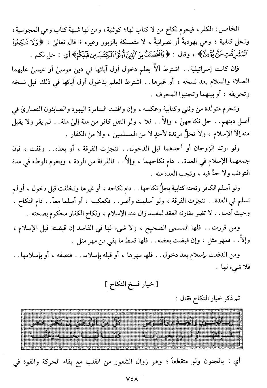الخامس: الكفر، فيحرم نكاح من لا كتاب لها؛ كوثنية، ومن لها شبهة كتاب وهي المجوسية، وتحل كتابية؛ وهي يهودية أو نصرانية، لا متمسكة بالزبور وغيره؛ قال تعالى: {ولا تنكحوا المشركت حتى يؤمن}، وقال: {والمحصنت من الذين اوتوا الكئب من قبلكم} أي: حل لكم.