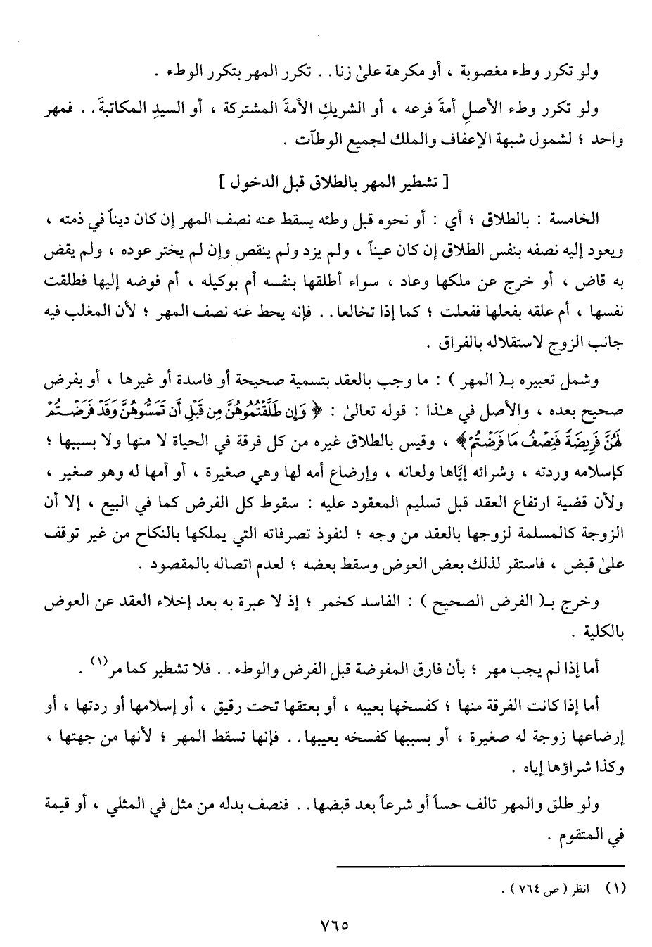 وشمل تعبيره بـ (المهر): ما وجب بالعقد بتسمية صحيحة أو فاسدة أو غيرها، أو بفرض صحيح بعده، والأصل في هذا: قوله تعالى: {وإن طلقتموهن من قبل أن تمسوهن وقد فرضتم لهن فريضة فنصف ما فرضتم}، وقيس بالطلاق غيره من كل فرقة في الحياة لا منها ولا بسببها؛ كإسلامه وردته، وشرائه إياها ولعانه، وإرضاع أمه لها وهى صغيرة، أو أمها له وهو صغير، ولأن قضية ارتفاع العقد قبل تسليم المعقود عليه: سقوط كل الفرض كما في البيع، إلا أن الزوجة كالمسلمة لزوجها بالعقد من وجه؛ لنفوذ تصرفاته التي يملكها بالنكاح من غير توقف على قبض، فاستقر لذلك بعض العوض وسقط بعضه؛ لعدم اتصاله بالمقصود.
