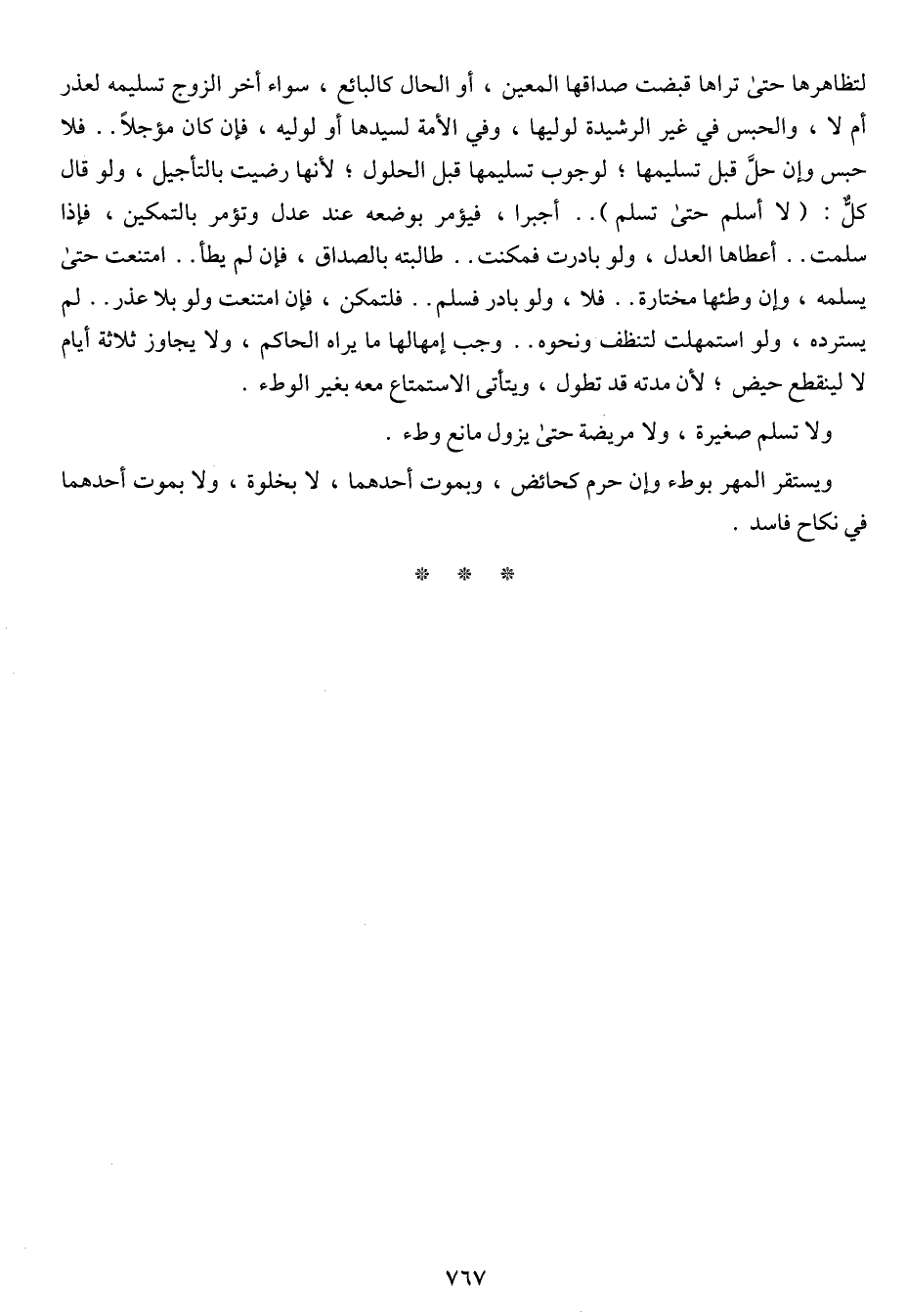 لتظاهرها حتى تراها قبضت صداقها المعين، أو الحال كالبائع، سواء أخر الزوج تسليمه لعذر أم لا، والحبس في غير الرشيدة لوليها، وفي الأمة لسيدها أو لوليه، فإن كان مؤجلا .. فلا حبس وإن حل قبل تسليمها؛ لوجوب تسليمها قبل الحلول؛ لأنها رضيت بالتأجيل، ولو قال كل: (لا أسلم حتى تسلم) .. أجبرا، فيؤمر بوضعه عند عدل وتؤمر بالتمكين، فإذا سلمت .. أعطاها العدل، ولو بادرت فمكنت .. طالبته بالصداق، فإن لم يطأ .. امتنعت حتى يسلمه، وإن وطئها مختارة .. فلا، ولو بادر فسلم .. فلتمكن، فإن امتنعت ولو بلا عذر .. لم يسترده، ولو استمهلت لتنظف ونحوه .. وجب إمهالها ما يراه الحاكم، ولا يجاوز ثلاثة أيام لا لينقطع حيض؛ لأن مدته قد تطول، ويتأتى الاستمتاع معه بغير الوطء.