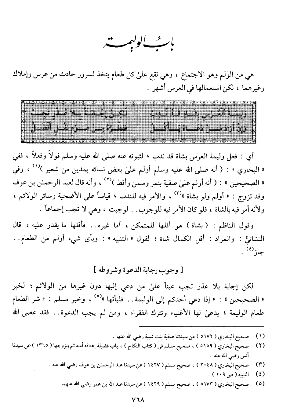 (وليمة العرس بشاة قد ندب ... لكن إجابة بلا عذر تجب)