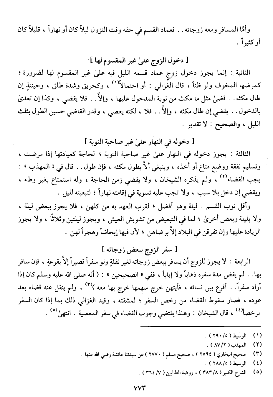 الرابعة: لا يجوز للزوج أن يسافر ببعض زوجاته لغير نقلة ولو سفراً قصيراً إلا بقرعة, فإن سافر بها .. لم يقض مدة سفره ذهاباً ولا إياباً, ففي «الصحيحين»: (أنه صلى الله عليه وسلم كان إذا أراد سفراً .. أقرع بين نسائه, فأيتهن خرج سهمها خرج بها معه) , ولم ينقل عنه قضاء بعد عوده, فصار سقوط القضاء من رخص السفر؛ لمشقته, وقيد الغزالي ذلك بما إذا كان السفر مرخصاً, قال الشيخان: وهذا يقتضي وجوب القضاء في سفر المعصية. انتهى.
