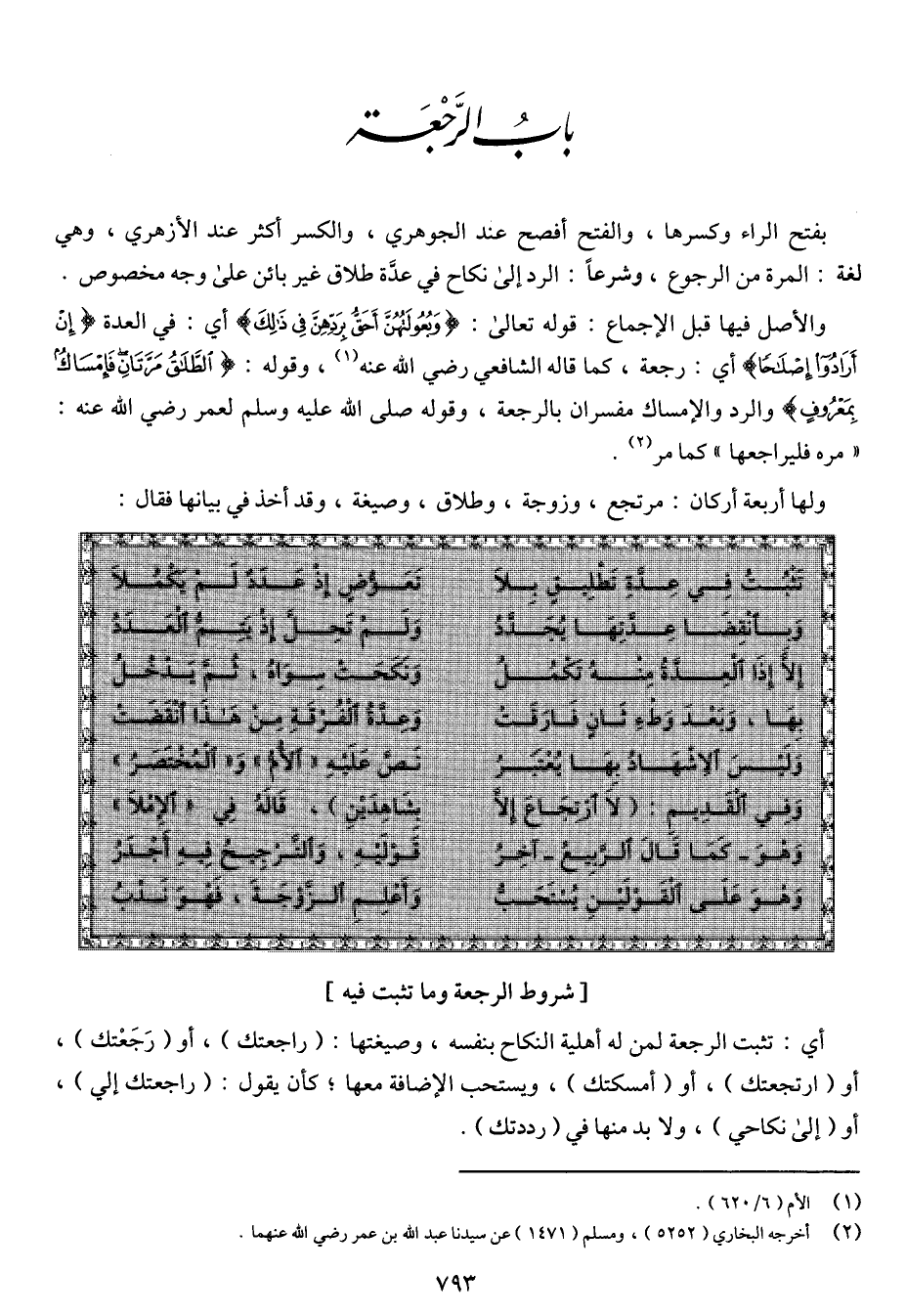 والأصل فيها قبل الإجماع: قوله تعالى: {وَبُعُولَتُهُنَّ أَحَقُّ بِرَدِّهِنَّ فِي ذَلك} [البقرة: 228] أي: في العدة {إِنْ أَرَادُوا إِصْلَاحًا} [البقرة: 228] أي: رجعة, كما قاله الشافعي رضي الله عنه, وقوله: {الطَّلَاقُ مَرَّتَانِ فَإِمْسَاكٌ بِمَعْرُوفٍ} [البقرة: 229] والرد والإمساك مفسران بالرجعة, وقوله صلى الله عليه وسلم لعمر رضي الله عنه: «مره فليراجعها» كما مر.
