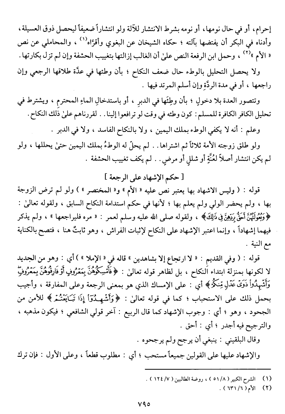قوله: (وليس الاشهاد بها يعتبر نص عليه «الأم» و «المختصر») ولو لم ترض الزوجة بها, ولم يحضر الولي ولم يعلم بها؛ لأنها في حكم استدامة النكاح السابق, ولقوله تعالى: {وَبُعُولَتُهُنَّ أَحَقُّ بِرَدِّهِنَّ فِي ذَلك} [البقرة: 228] , ولقوله صلى الله عليه وسلم لعمر: «مره فليراجعها» , ولم يذكر فيهما إشهاداً, وإنما اعتبر الإشهاد على النكاح لإثبات الفراش, وهو ثابت هنا, فتصح بالكناية مع النية.
