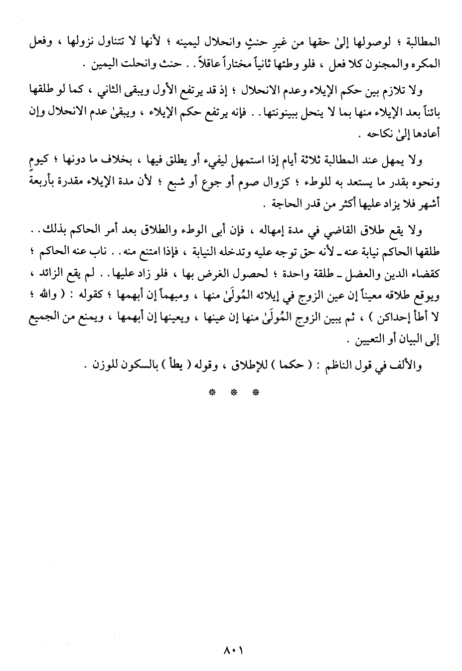 ولا يقع طلاق القاضي في مدة إمهاله, فإن أبى الوطء والطلاق بعد أمر الحاكم بذلك .. طلقها الحاكم نيابة عنه – لأنه حق توجه عليه وتدخله النيابة, فإذا امتنع منه .. ناب عنه الحاكم؛ كقضاء الدين والعضل - طلقة واحدة؛ لحصول الغرض بها فلو زاد عليها .. لم يقع الزائد ويوقع طلاقه معيناً إن عين الزوج في إيلائه المُولى منها, ومبهماً إن أبهمها؛ كقوله: (والله؛ لا أطأ إحداكن) , ثم يبين الزوج المُولى منها إن عينها, ويعينها إن أبهمها, ويمنع من الجميع إلى البيان أو التعيين.