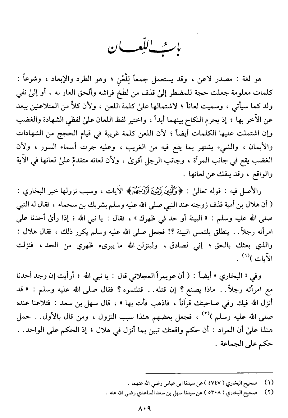 وفي «البخاري» أيضاً: (أن عويمراً العجلاني قال: يا نبي الله؛ أرأيت إن وجد أحدنا مع امرأته رجلاً .. ماذا يصنع؟ إن قتله .. قتلتموه؟ فقال صلى الله عليه وسلم: «قد أنزل الله فيك وفي صاحبتك قرآناً, فاذهب فأت بها» , قال سهل بن سعد: فتلاعنا عنده صلى الله عليه وسلم) , فجعل بعضهم هذا سبب النزول, ومن قال بالأول .. حمل هذا على أن المراد: أن حكم واقعتك تبين بما أنزل في هلال؛ إذ الحكم على الواحد .. حكم على الجماعة