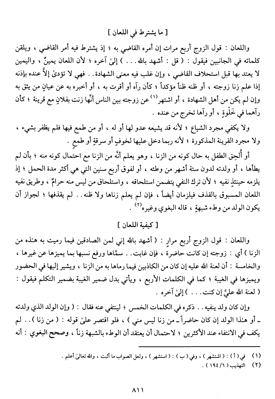 واللعان: قول الزوج أربع مرار: (أشهد بالله إني لمن الصادقين فيما رميت به هذه من الزنا) أي: زوجته إن كانت حاضرة, فإن غابت .. سمّاها ورفع نسبها بما يميزها عن غيرها, والخامسة: أن لعنة الله عليه إن كان من الكاذبين فيما رماها به من الزنا, ويشير إليها في الحضور ويميزها في الغيبة؛ كما في الكلمات الأربع, ويأتي بدل ضمير الغيبة بضمير التكلم فيقول: (لعنة الله علي إن كنت ... ) إلى اخره.