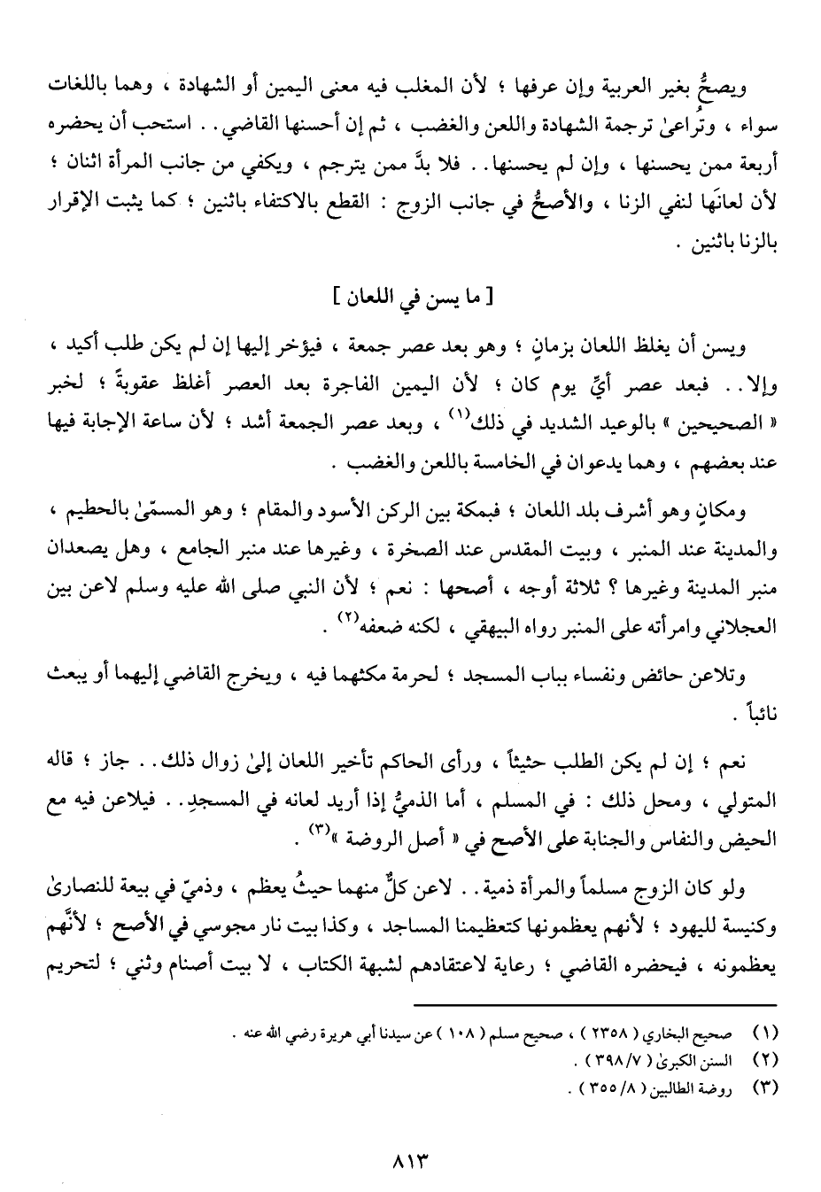 ولو كان الزوج مسلماً والمرأة ذمية .. لاعن كلّ منهما حيث يعظم, وذمي في بيعة للنصارى وكنيسة لليهود؛ لأنهم يعظمونها كتعظيمنا المساجد, وكذا بيت نار مجوسي في الأصح؛ لأنهم يعظمونه, فيحضره القاضي؛ رعاية لاعتقادهم لشبهة الكتاب, لا بيت أصنام وثني؛ لتحريم