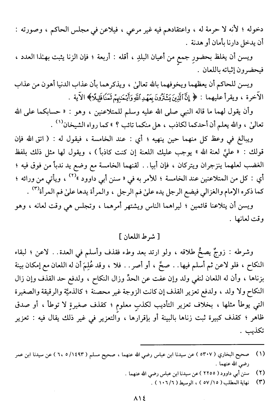 ويبالغ في وعظ كل منهما حين ينهيه؛ أي: عند الخامسة, فيقول له: (اتق الله فإن قولك: «عليَّ لعنة الله» يوجب عليك اللعنة إن كنت كاذباً) , ويقول لها مثل ذلك بلفظ الغضب لعلهما ينزجران ويتركان, فإن أبيا .. لقنهما الخامسة مع وضع يد ندباً من فوق فيه؛ أي: كل من المتلاعنين عند الخامسة؛ للأمر به في «سنن أبي داوود» , ويأتي من ورائه؛ كما ذكره الإمام والغزالي فيضع الرجل يده على فم الرجل, والمرأة يدها على فم المرأة.