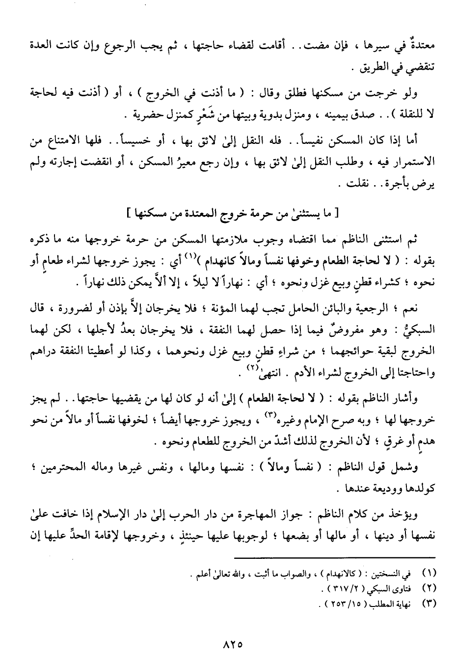 ثم استثنى الناظم مما اقتضاه وجوب ملازمتها المسكن من حرمة خروجها منه ما ذكره بقوله: (لا لحاجة الطعام وخوفها نفساً ومالاً كانهدام) " أي: يجوز خروجها لشراء طعام أو نحوه؛ كشراء قطن وبيع غزل ونحوه؛ أي: نهاراً لا ليلاً, إلا ألاً يمكن ذلك نهاراً.