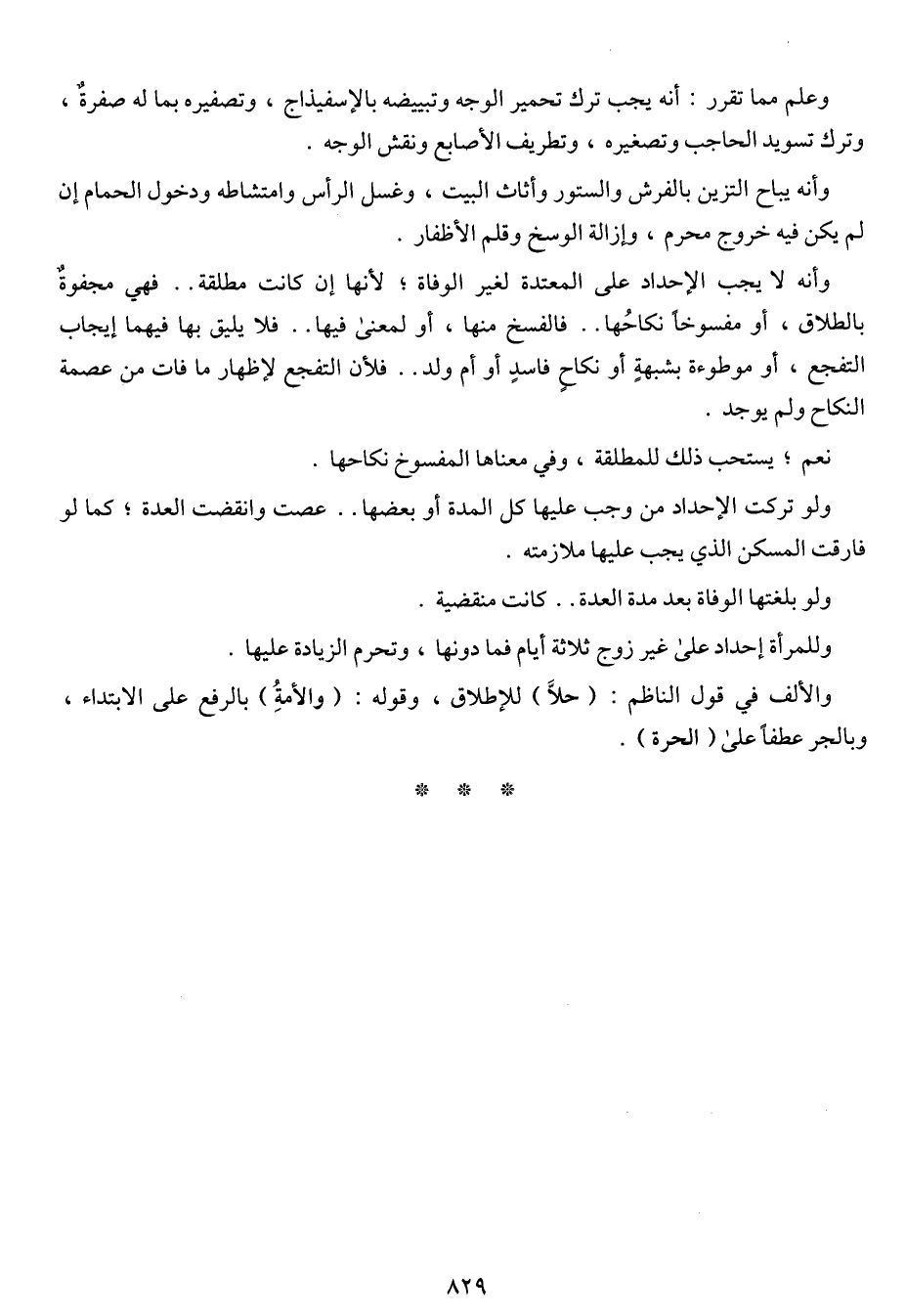 وأنه لا يجب الإحداد على المعتدة لغير الوفاة؛ لأنها إن كانت مطلقة .. فهي مجفوةٌ بالطلاق, أو مفسوخاً نكاحها .. فالفسخ منها, أو لمعنى فيها .. فلا يليق بها فيهما إيجاب التفجع, أو موطوءة بشبهة أو نكاح فاسد أو أم ولد .. فلأن التفجع لإظهار ما فات من عصمة النكاح ولم يوجد.