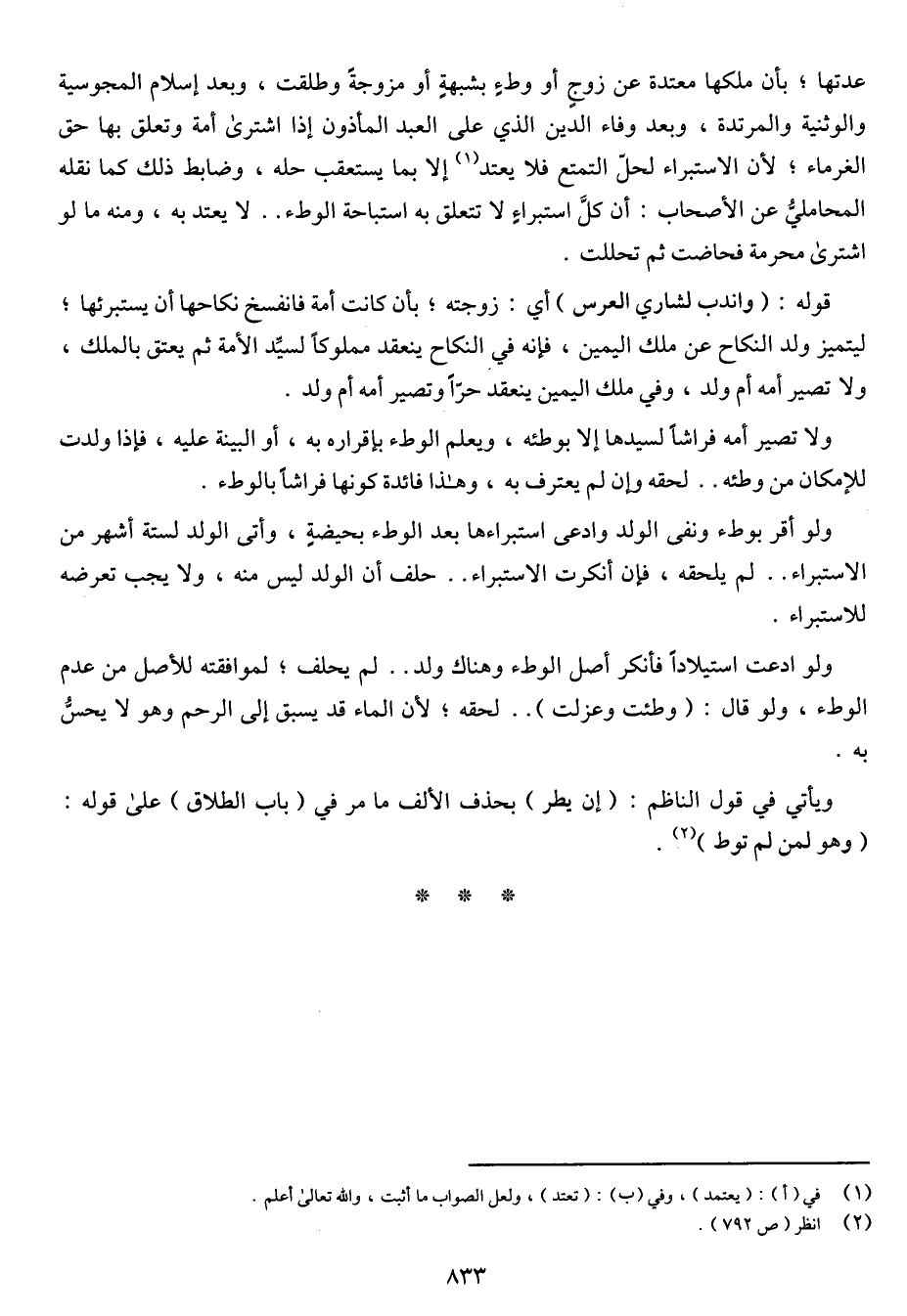 عدتها؛ بأن ملكها معتدة عن زوج أو وطاء بشبهة أو مزوجة وطلقت, وبعد إسلام المجوسية والوثنية والمرتدة, وبعد وفاء الدين الذي على العبد المأذون إذا اشترى أمة وتعلق بها حق الغرماء؛ لأن الاستبراء لحل التمتع فلا يعتد" إلا بما يستعقب حله, وضابط ذلك كما نقله المحاملي عن الأصحاب: أن كل استبراء لا تتعلق به استباحة الوطء .. لا يعتد به, ومنه ما لو اشترى محرمة فحاضت ثم تحللت.