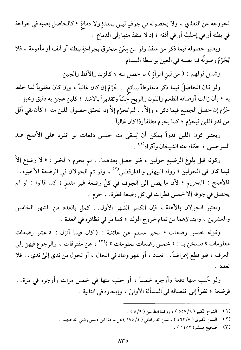 وكونه قبل بلوغ الرضيع حولين, فلو حصل بعدهما .. لم يحرم الخبر: «لا رضاع إلا فيما كان في الحولين) رواه البيهقي والدارقطني", ولو تم الحولان في الرضعة الأخيرة .. فالأصح: التحريم؛ لأن ما يصل إلى الجوف في كل رضعة غير مقدر؛ كما قالوا: لو لم يحصل في جوفه إلا خمس قطرات في كل رضعة قطرة .. حرم.
