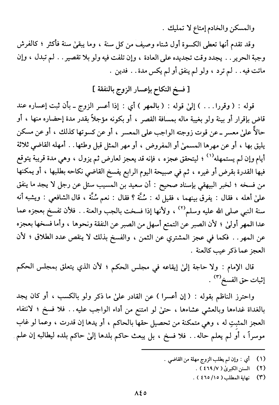 قوله: (وقررا ... ) إلى قوله: (بالمهر) أي: إذا أعسر الزوج – بأن ثبت إعساره عند قاض بإقرار أو بينة ولو بغيبة ماله بمسافة القصر, أو بكونه مؤجلاً بقدر مدة إحضاره منها, أو حالاً على معسر - عن قوت زوجته الواجب على المعسر, أو عن كسوتها كذلك, أو عن مسكن يليق بها, أو عن مهرها المسمى أو المفروض, أو مهر المثل قبل وطئها .. أمهله القاضي ثلاثة أيام وإن لم يستمهله؛ ليتحقق عجزه, فإنه قد يعجز لعارض ثم يزول, وهي مدة قريبة يتوقع فيها القدرة بقرض أو غيره, ثم في صبيحة اليوم الرابع يفسخ القاضي نكاحه بطلبها, أو يمكنها من فسخه؛ لخبر البيهقي بإسناد صحيح: أن سعيد بن المسيب سئل عن رجل لا يجد ما ينفق على أهله, فقال: يفرق بينهما, فقيل له: سُتّة؟ فقال: نعم سُنّة, قال الشافعي: ويشبه أنه سنة النبي صلى الله عليه وسلم, ولأنها إذا فسخت بالجب والعنة .. فلأن تفسخ بعجزه عما عدا المهر أولى؛ لأن الصبر عن التمتع أسهل من الصبر عن النفقة ونحوها, وأما فسخها بعجزه عن المهر .. فكما في عجز المشتري عن الثمن, والفسخ بذلك لا ينقص عدد الطلاق؛ لأن العجز عما ذكر عيب كالعنة ..