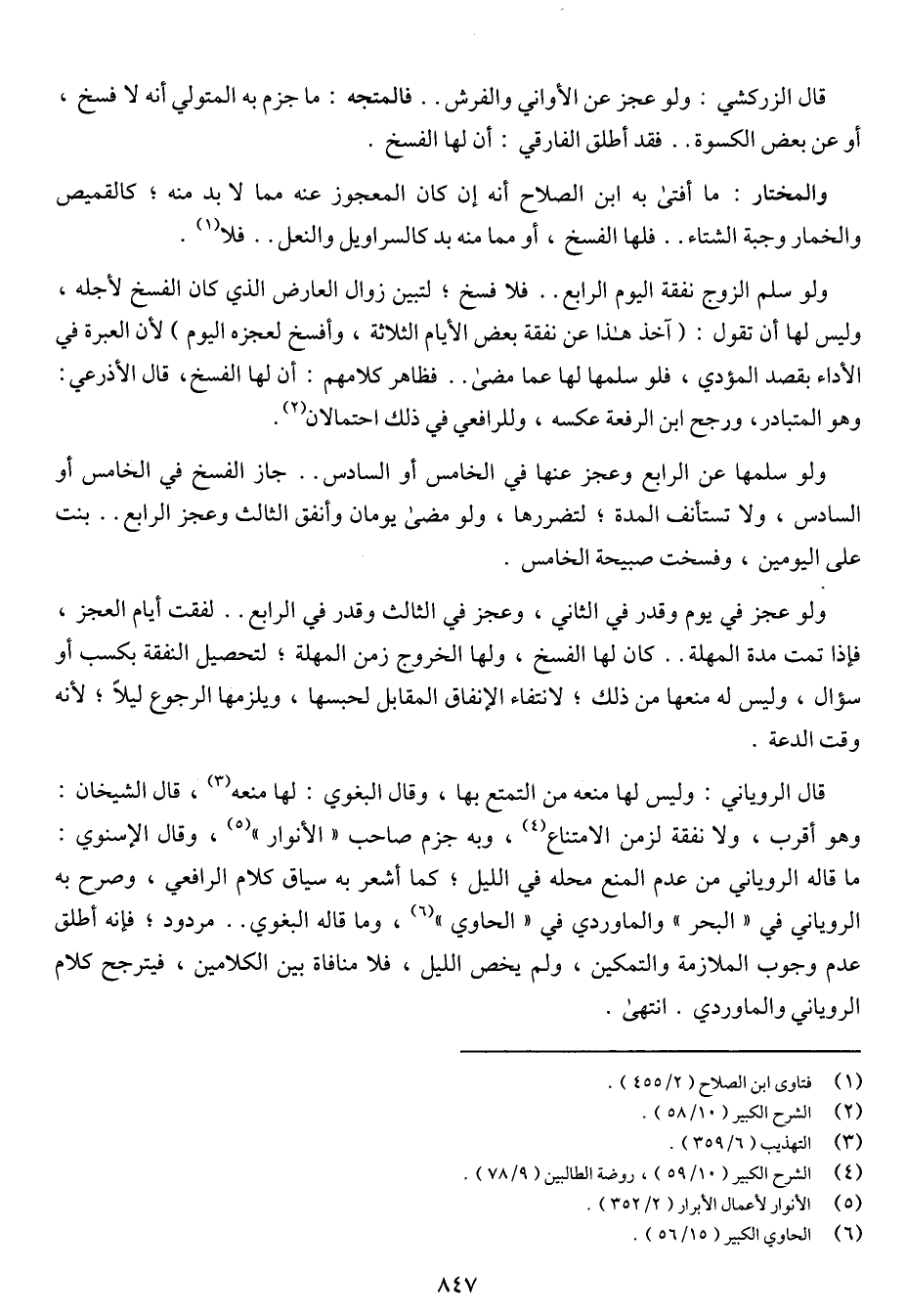 والمختار: ما أفتى به ابن الصلاح أنه إن كان المعجوز عنه مما لا بد منه؛ كالقميص والخمار وجبة الشتاء .. فلها الفسخ، أو مما منه بد كالسراويل والنعل .. فلا.