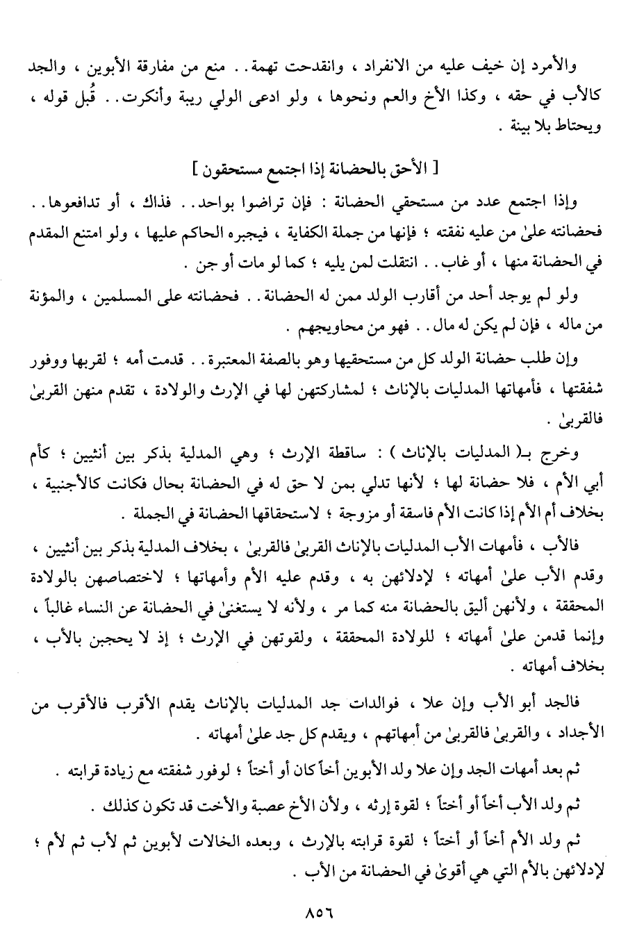 وإن طلب حضانة الولد كل من مستحقيها وهو بالصفة المعتبرة .. قدمت أمه؛ لقربها ووفور شفقتها، فأمهاتها المدليات بالإناث؛ لمشاركتهن لها في الإرث والولادة، تقدم منهن القربى فالقربى.