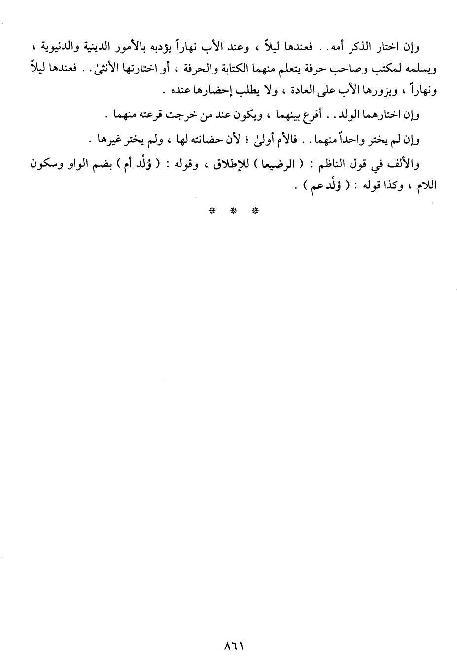 وإن اختار الذكر امه .. فعندها ليلاً، وعند الأب نهاراً يؤدبه بالأمور الدينية والدنيوية، ويسلمه لمكتب وصاحب حرفة يتعلم منهما الكتابة والحرفة، أو اختارتها الأنثى .. فعندها ليلاً ونهاراً، ويزورها الأب على العادة، ولا يطلب إحضارها عنده.