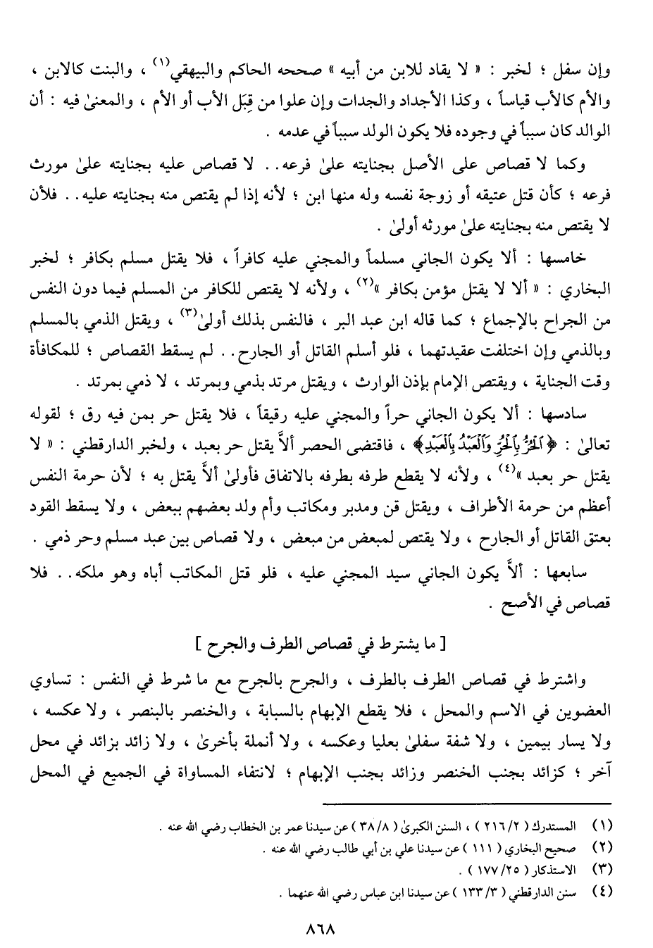 سادسها: ألا يكون الجاني حراً والمجني عليه رقيقاً، فلا يقتل حر بعبد، ولخبر الدارقطني: "لا يتقل حر بعبد" ولأنه لا يقطع طرفه بطرفه بالاتفاق فأولى ألا يقتل به؛ لأن حرمة النفس أعظم من حرمة الأطراف، ويقتل قن ومدبر ومكاتب وأم ولد بعضهم ببعض، ولا يسقط القود بعتق القاتل أو الجارح، ولا يقتص لمبعض من مبعض، ولا قصاص بين عبد مسلم وحر ذمي.