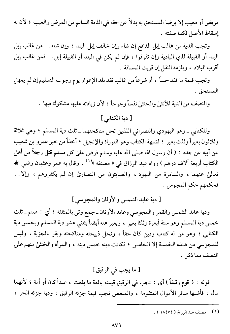 وللكتابي- وهو اليهودي والنصراني اللذين تحتل مناكحتهما- ثلث دية المسلم؛ وهي ثلاث وثلاثون بعيراً وثلث بعير؛ لشبهة الكتاب وهو التوراة والإنجيل؛ أخذا من خبر عمرو بن شعيب عن ابيه عن جده: (أن رسول الله صلى الله عليه وسلم فرض على كل مسلم قتل رجلاً من أهل الكتاب أربعة آلاف ردهم) رواه عبد الرزاق في "مصنفه" وقال به عمر وعثمان رضي الله تعالى عنهما، والسامرة من اليهود، والصابئون من النصارى إن لم يكفروهم، وإلا ... فحكمهم حكم المجوس.