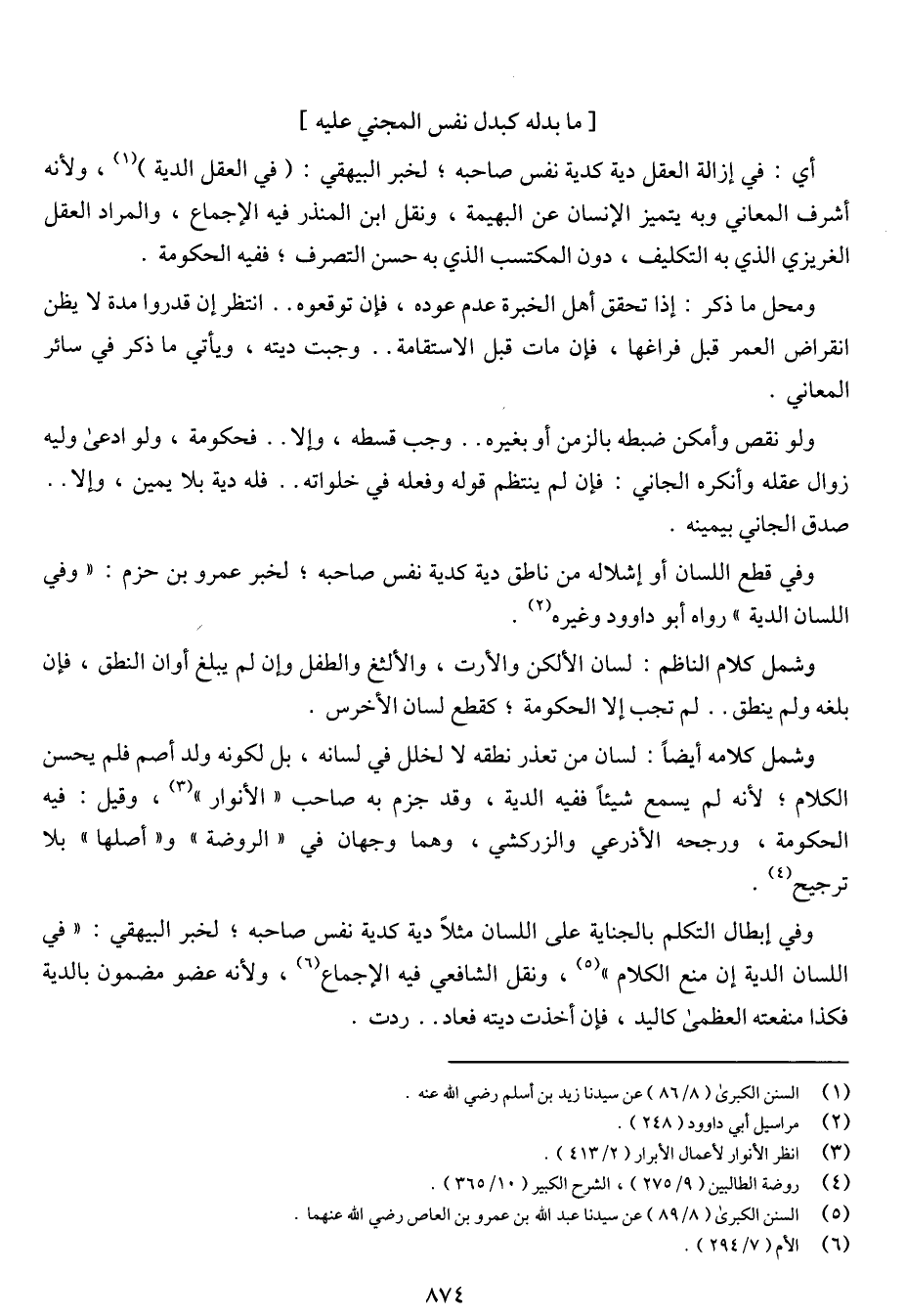 وفي إبطال التكلم بالجناية على اللسان مثلاً دية كدية نفس صاحبه، لخبر البيهقي: «في اللسان الدية إن منع الكلام» ونقل الشافعي فيه الإجماع، ولأنه عضو مضمون بالدية فكذا منفعته العظمى كاليد، فإن أخذت ديته فعاد .. ردت.