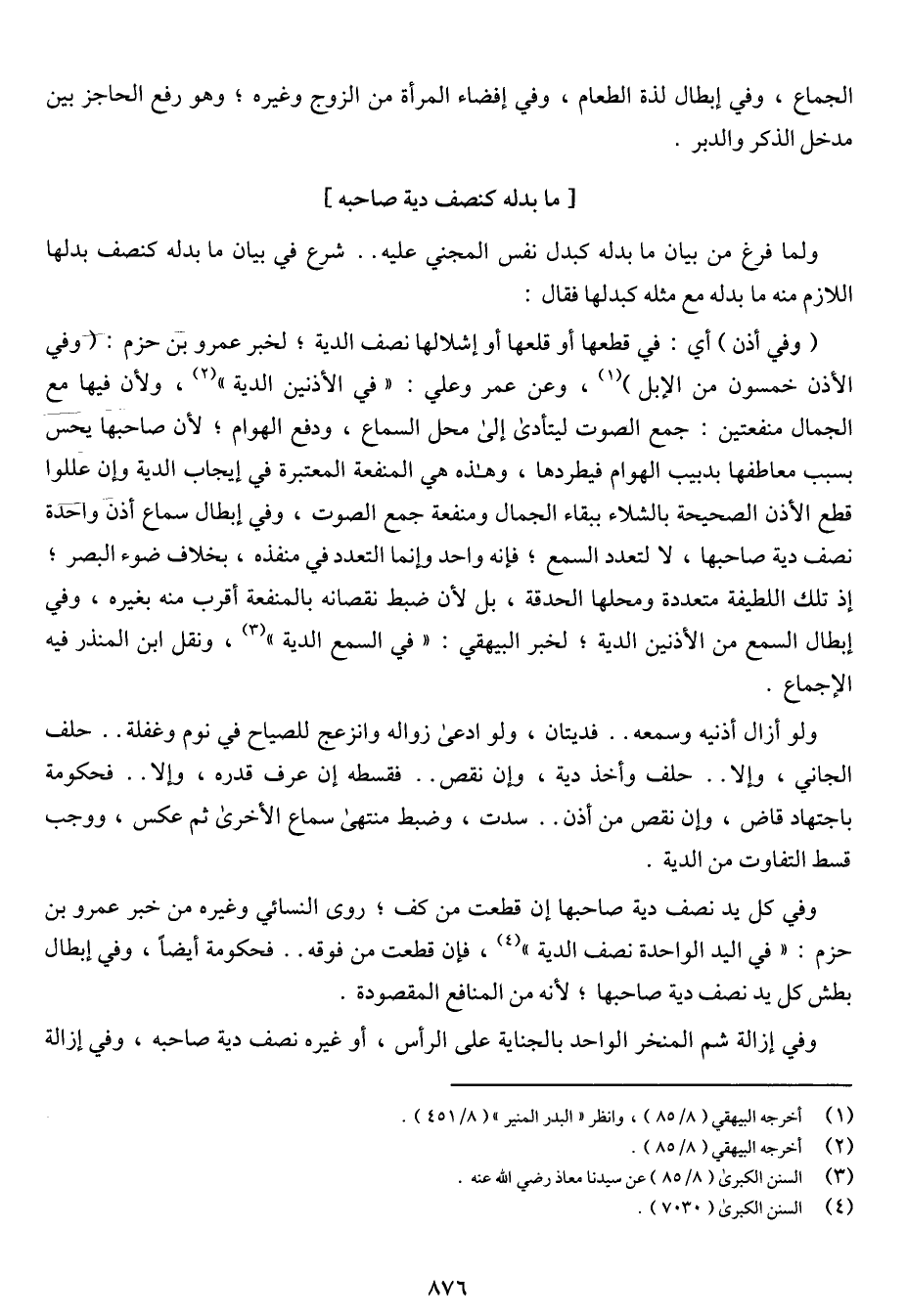 (وفي أذن): أي في قطعها أو قلعها أو إشلالها نصف الدية؛ لخبر عمرو بن حزم (وفي الأذن خمسون من الإبل) وعن عمرو وعلي: «في الأذنين الدية» ولأن فيها مع الجمال منفعتين: جمع الصوت ليتأدى إلى محل السماع، ودفع الهوام؛ لأن صاحبها يحس بسبب معاطفها بدبيب الهوام فيطردها، وهذه هي المنفعة المعتبرة في إيجاب الدية وإن عللوا قطع الأذن الصحيحة بالشلاء ببقاء الجمال ومنفعة جمع الصوت، وفي إبطال سماع أذن واحدة نصف دية صاحبها، لا لتعدد السمع؛ فإنه واحد وإنما التعدد في منفذه، بخلاف ضوء البصر، إذ تلك اللطيفة متعددة ومحلها الحدقة، وبل لأن ضبط نقصانه بالمنفعة أقرب منه بغيره، وفي إبطال السمع من الأذنين الدية؛ لخبر البيهقي: «في السمع الدية» ونقل ابن المنذر فيه الإجماع.