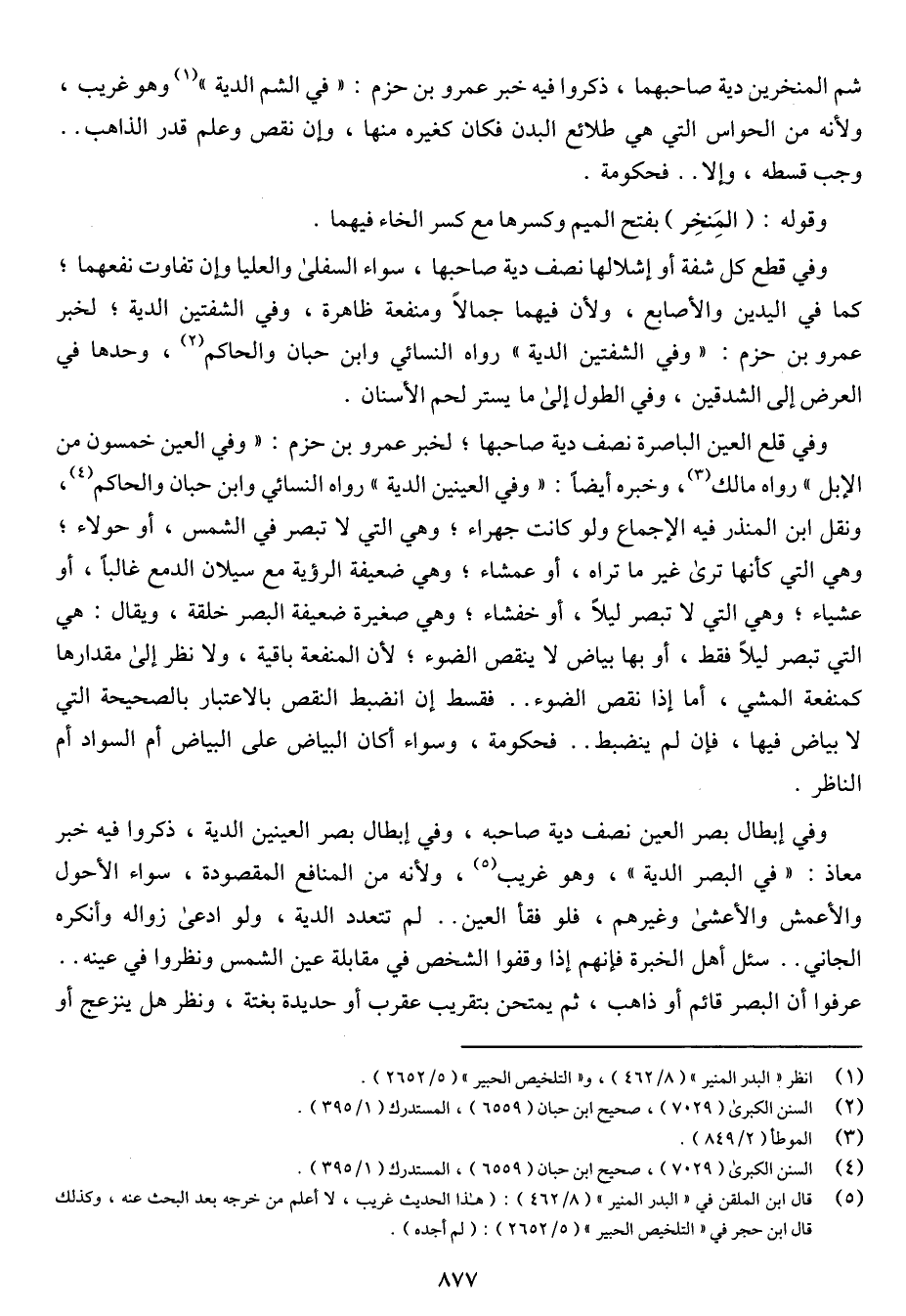 شم المنخرين دية صاحبهما، ذكروا فيه خبر عمرو بن حزم: «في الشم الدية» وهو غريب، ولأنه من الحواس التي هي طلائع البدن فكان كغيره منها، وإن نقص وعلم قدر الذاهب .. وجب قسطه، وإلا .. فحكومة.