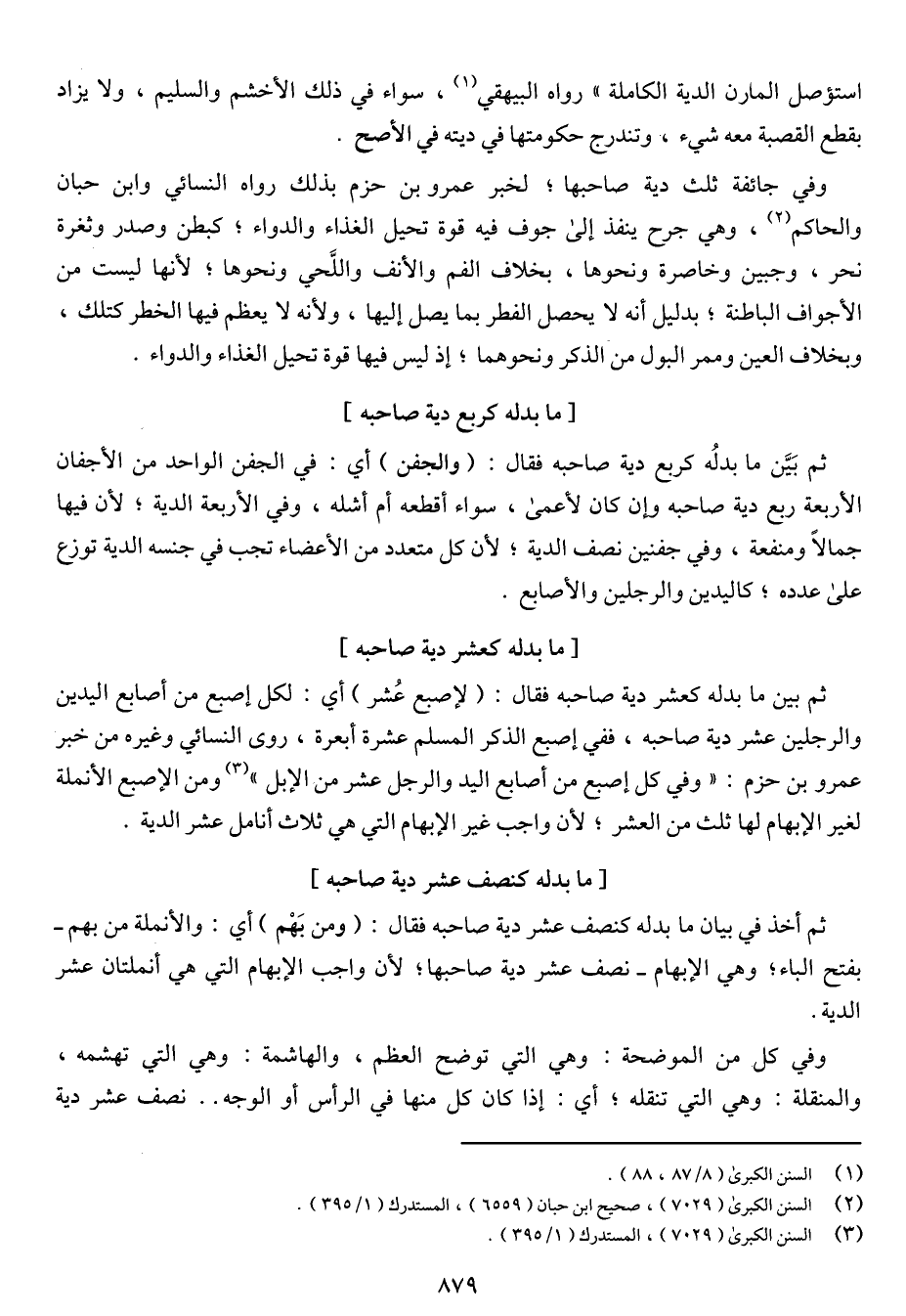 وفي جائفة ثلث دية صاحبها؛ لخبر عمرو بن حزم بذلك رواه النسائي وابن حبان والحاكم، وهي جرح ينفذ إلى جوف فيه قوة تحيل الغذاء والدواء؛ كبطن وصدر وثغرة نحر، وجبين وخاصرة ونحوها، بخلاف الفم والأنف واللحي ونحوها؛ لأنها ليست من الأجواف الباطنة؛ بدليل أنه لا يحصل الفطر بما يصل إليها، ولأنه لا يعظم فيها الخطر كتلك، وبخلاف العين وممر البول من الذكر ونحوهما؛ إذ ليس فيها قوة تحيل الغذاء والدواء.