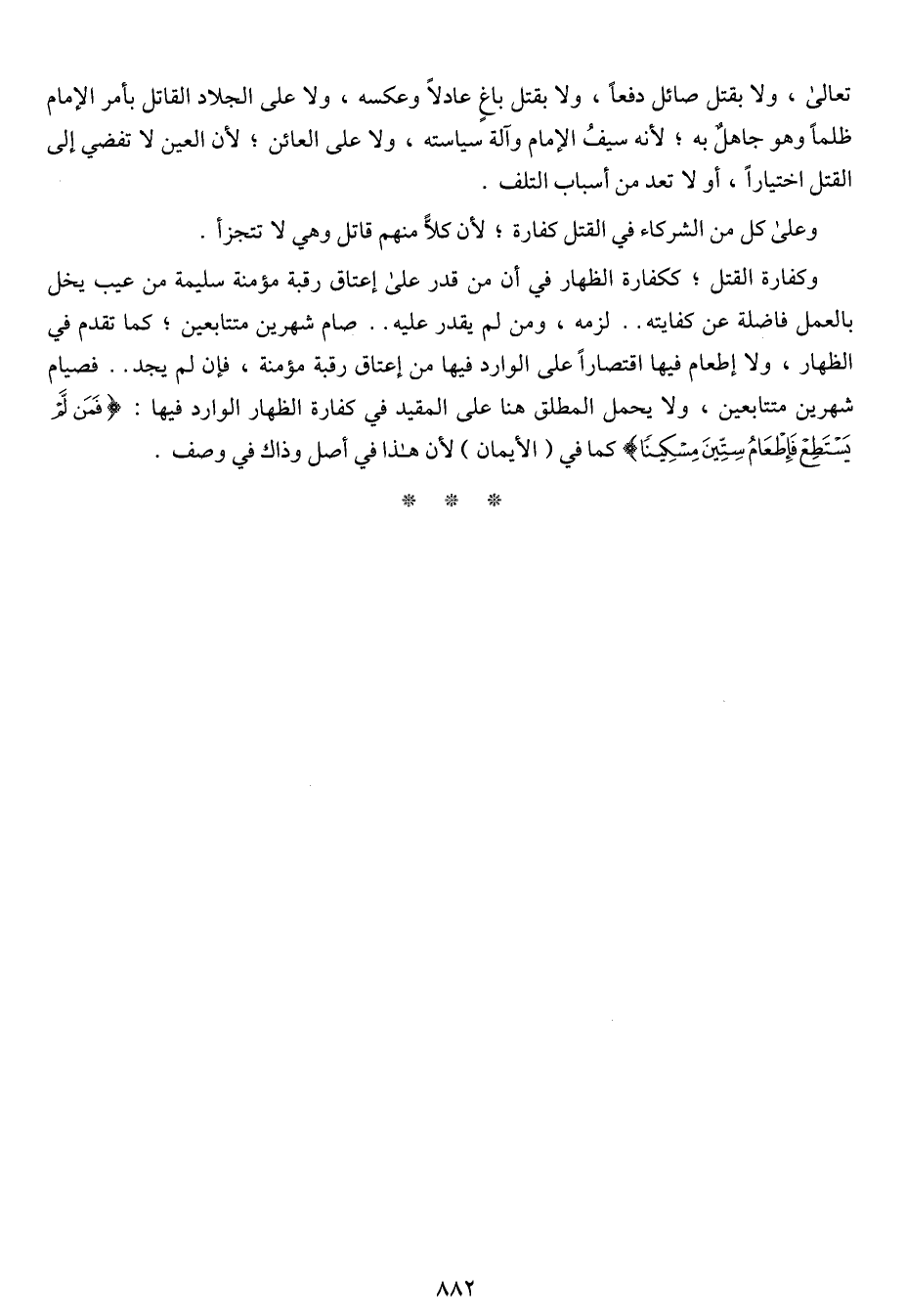 وكفارة القتل؛ ككفارة الظهار في أن من قدر على إعتاق رقبة مؤمنة سليمة من عيب يخل بالعمل فاضلة عن كفايته .. لزمه، ومن لم يقدر عليه .. صام شهرين متتابعين؛ كما تقدم في الظهار، ولا إطعام فيها اقتصاراً على الوارد فيها من إعتاق رقبة مؤمنة، فإن لم يجد .. فصيام شهرين متتابعين، ولا يحمل المطلق هنا على المقيد في كفارة الظهار الوارد فيها: {فمن لم يستطع فإطعام ستين مسكينا} كما في (الأيمان) لأن هذا في أصل وذاك في وصف.
