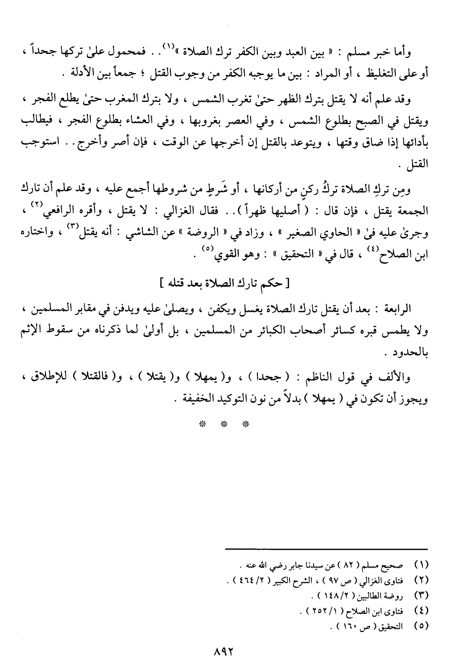 وأما خبر مسلم: «بين العبد وبين الكفر ترك الصلاة» .. فمحمول على تركها جحداً، أو على التغليظ، أو المراد: بين ما يوجبه الكفر من وجوب القتل؛ جمعاً بين الأدلة.