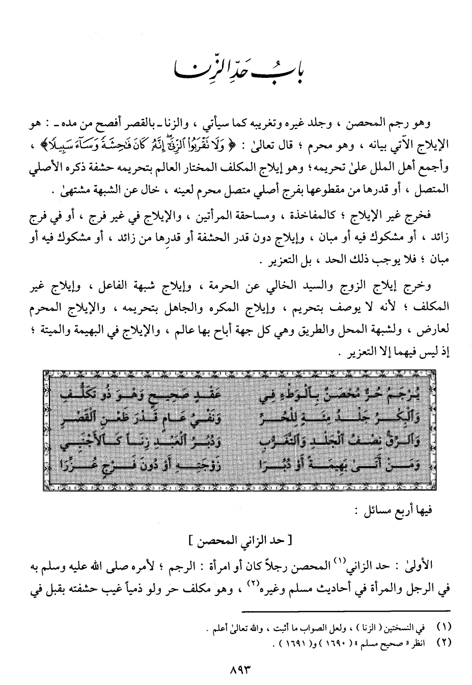 الأولى: حد الزاني المحصن رجلاً كان أو امرأة: الرجم، لأمره صلى الله عليه وسلم به في الرجل والمرأة في أحاديث مسلم وغيره، وهو مكلف حر ولو ذمياً غيب حشفته بقبل في