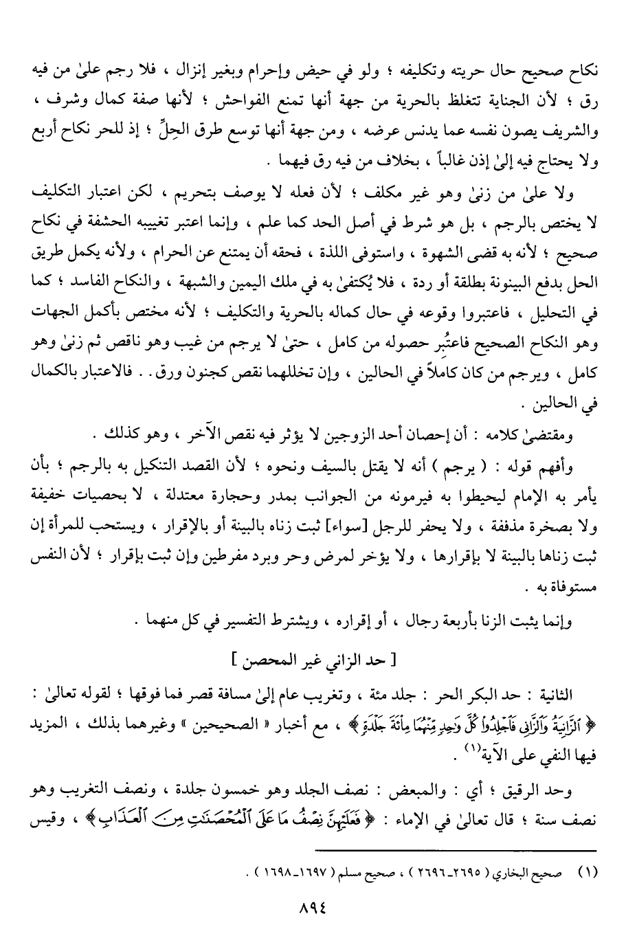 نكاح صحيح حال حريته وتكليفه؛ لو في حيض وإحرام وبغير إنزال، فلا رجم على من فيه رق؛ لأن الجناية تتغلظ بالحرية من جهة أنها تمنع الفواحش؛ لأنها صفة كمال وشرف، والشريف يصون نفسه عما يدنس عرضه، ومن جهة أنها توسع طرق الحل؛ إذ للحر نكاح أربع ولا يحتاج فيه إلى إذن غالباً، بخلاف من فيه رق فيهما.