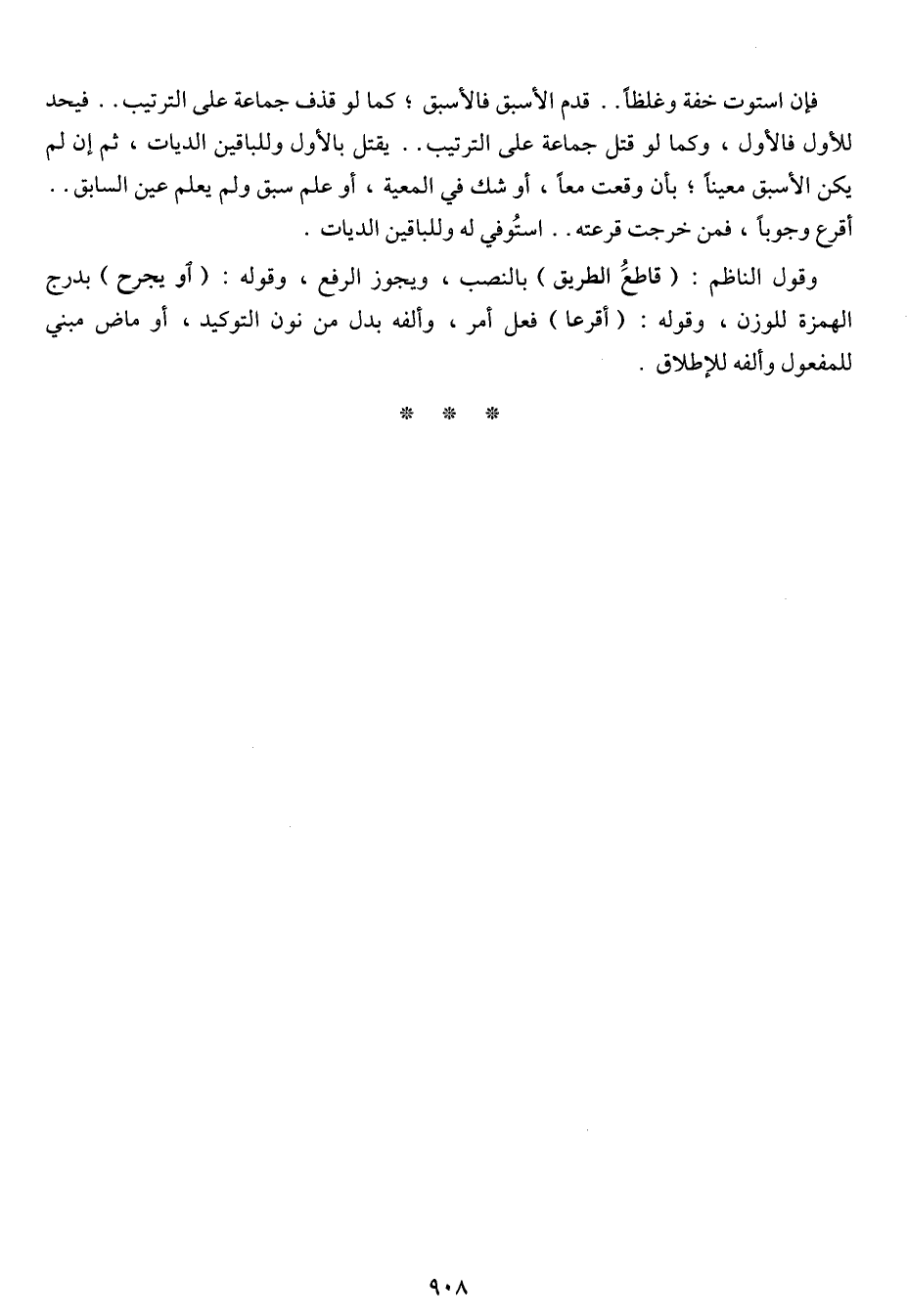 وقول الناظم: (قاطع الطريق) بالنصب، ويجوز الرفع، وقوله: (أو يجرح) بدرج الهمزة للوزن/ وقوله: (اقرعا) فعل امر، وألفه بدل من نون التوكيد، أو ماض مبني للفعول وألفه للإطلاق.