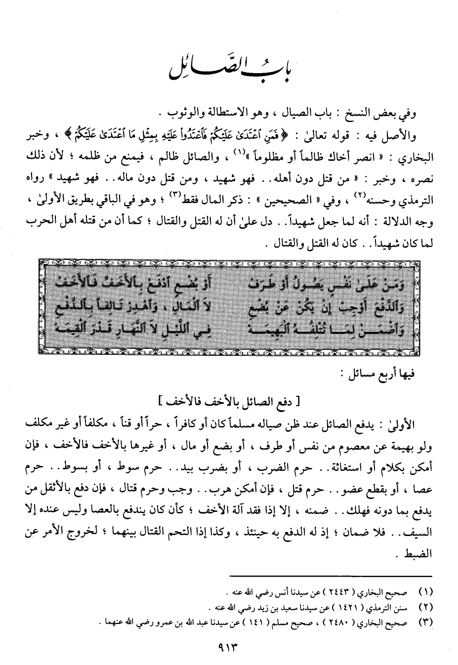 الأولى: يدفع الصائل عند ظن صياله مسلماً كان أو كافراً، حراً أو قناً، ومكلفاً أو غير مكلف ولو بهيمة عن معصوم من نفس أو طرف، أو بضع أو مال، أو غيرها بالأخف فالأخف، فإن أمكن بكلام أو استغاثة .. جرم الضرب، أو بضرب بيد .. حرم سوط، أو بسوط .. حرم عصا، أو بقطع عضو .. حرم قتل، فإن أمكن هرب .. وجب وحرم قتال، فإن دفع بالأثقل من يدفع بما دونه فهلك ... ضمنه، إلا إذا فقد آلة الأخف؛ كأن كان يندفع بالعصا وليس عنده إلا السيف .. فلا ضمان؛ إذ له الدفع به حينئذ، وكذا إذا التحم القتال بينهما؛ لخروج الأمر عن الضبط.